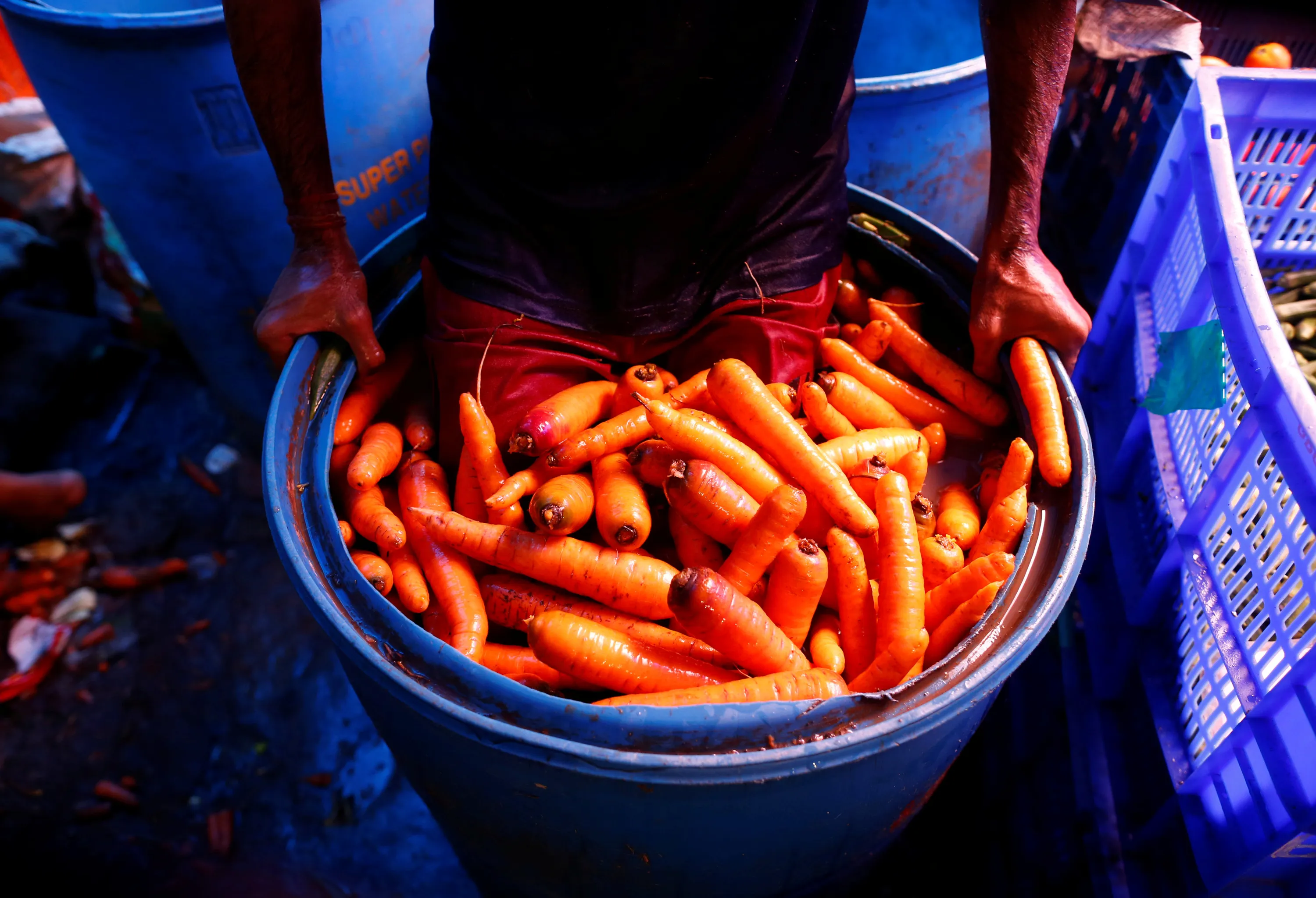 A worker washes carrots in a plastic drum at a wholesale vegetable market in Mumbai, India, June 14, 2016. (Photo by Danish Siddiqui/Reuters)