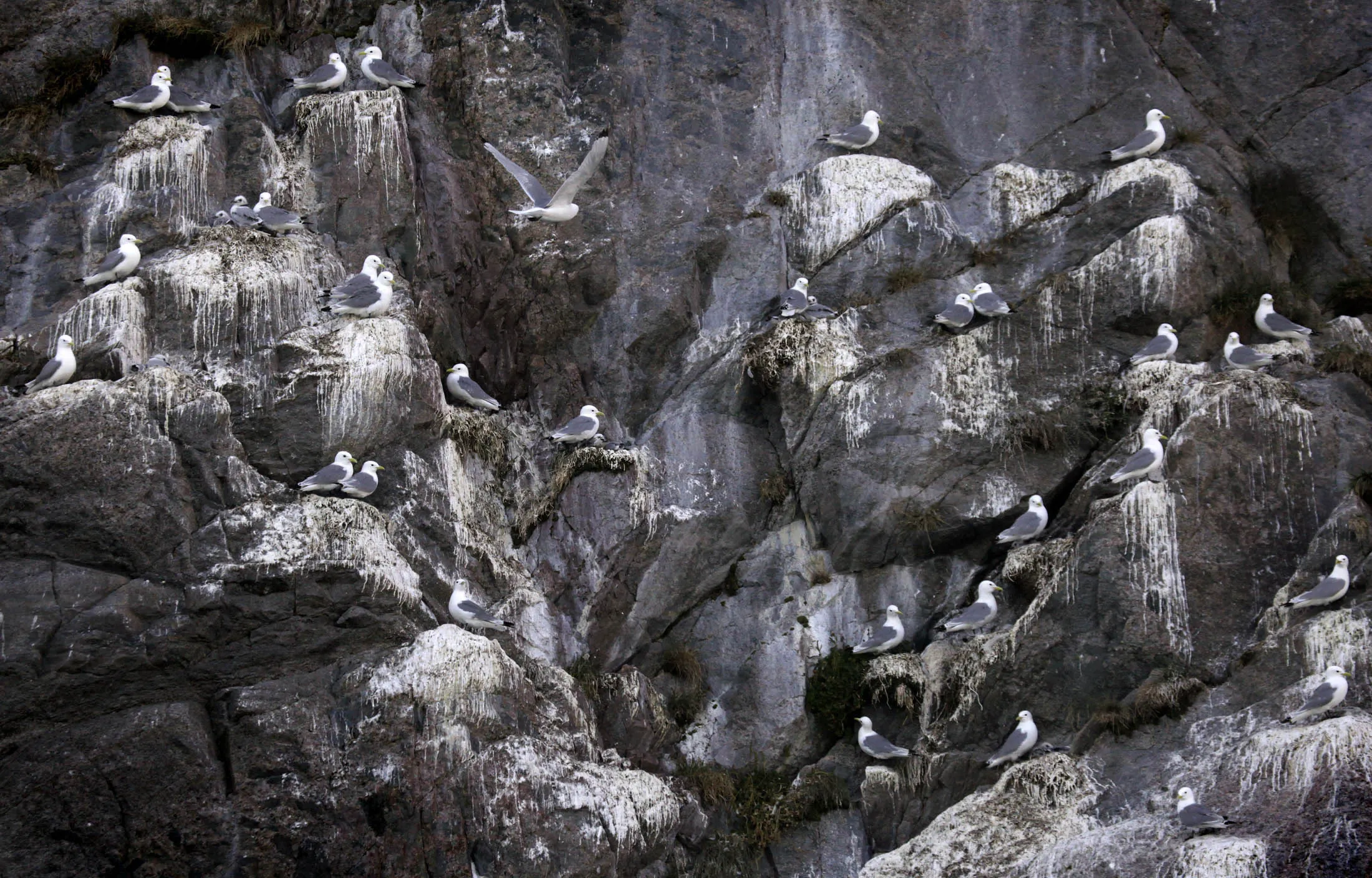 A colony of Black-legged Kittiwake seagulls tend to their chicks on a cliff near the south Greenland town of Narsaq July 28, 2009. (Photo by Bob Strong/Reuters)