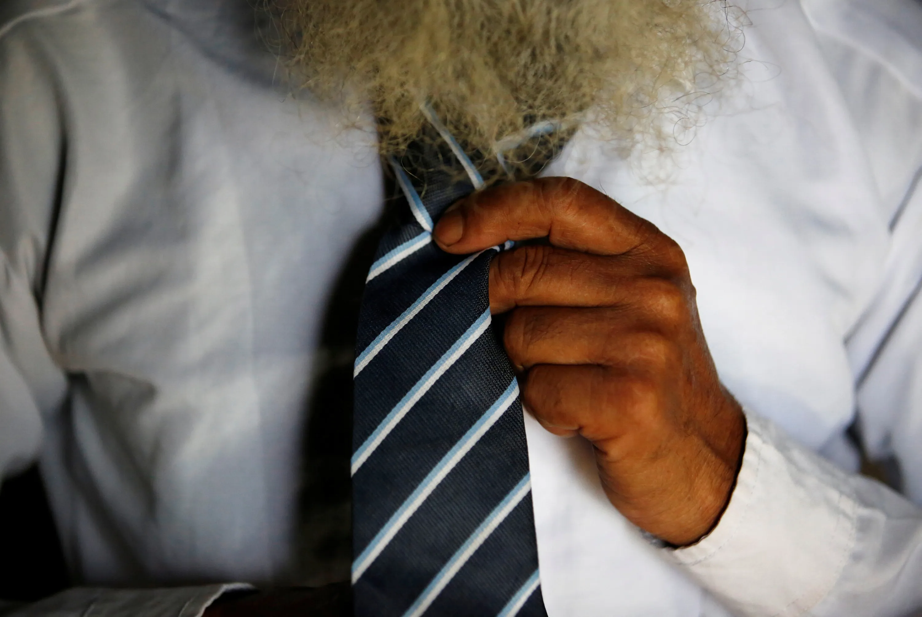 Durga Kami, 68, who is studying tenth grade at Shree Kala Bhairab Higher Secondary School, adjusts his school uniform tie as he gets ready for school in Syangja, Nepal, June 5, 2016. (Photo by Navesh Chitrakar/Reuters)