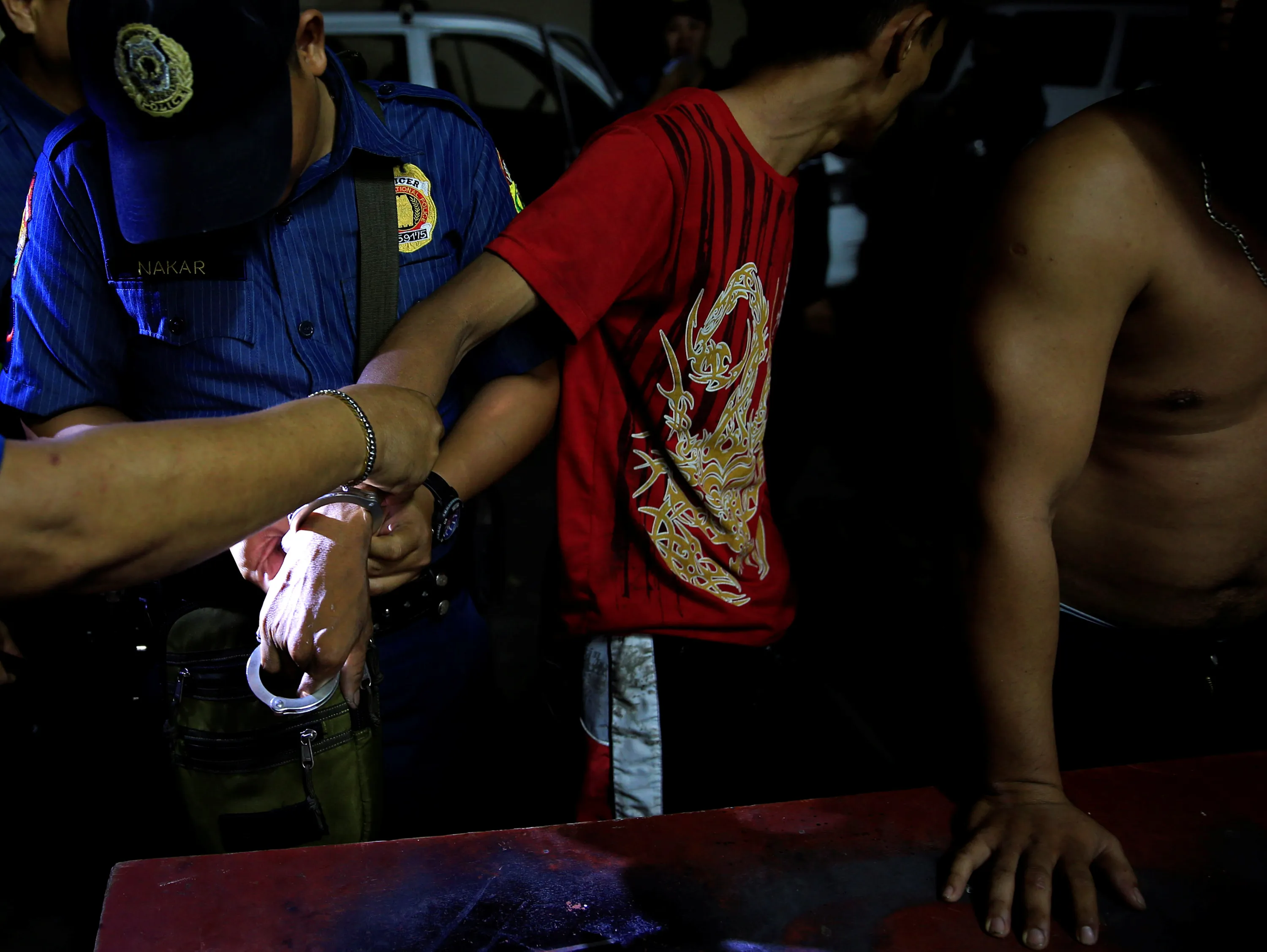 A member of the Philippine National Police handcuffs a man after he tried to escape detention during the “Rid the Streets of Drinkers and Youth” operation in Las Pinas city, metro Manila, Philippines June 1, 2016. (Photo by Romeo Ranoco/Reuters)