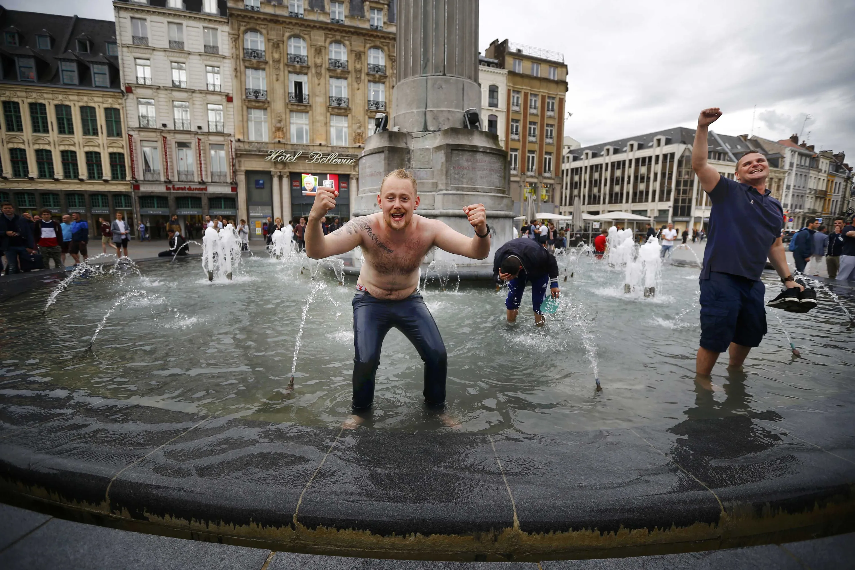 Football Soccer EURO 2016 Lens, France on June 16, 2016. England fans celebrate their team's win in a fountain in Lille. (Photo by Pascal Rossignol/Reuters)