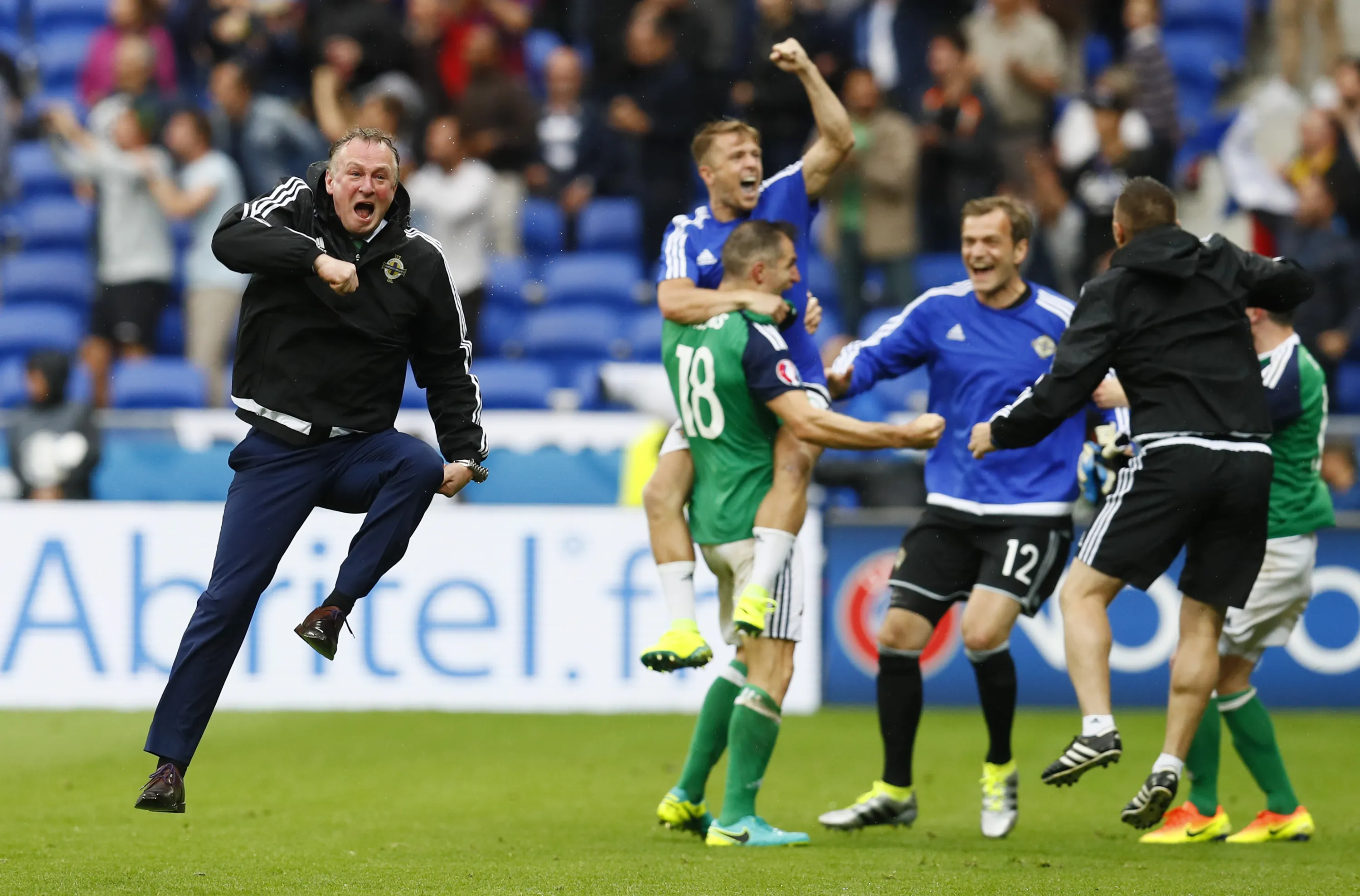 Football Soccer, Ukraine vs Northern Ireland, EURO 2016, Group C, Stade de Lyon, Lyon, France on June 16, 2016. Northern Ireland head coach Michael O'Neill celebrates after Northern Ireland's Niall McGinn scores their second goal. (Photo by Jason Cairnduff/Reuters/Livepic)