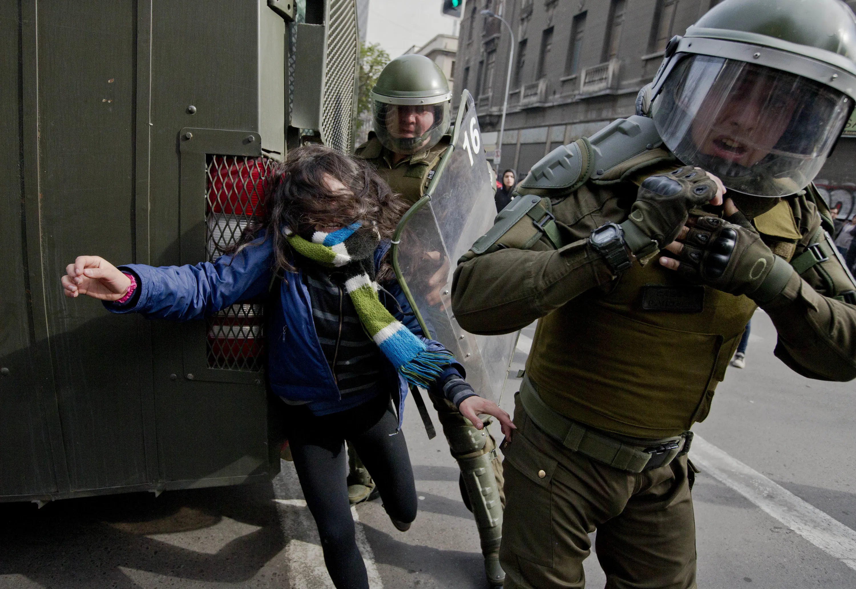 A high school student is detained by police during a march in downtown Santiago, Chile, Wednesday, June 15, 2016. Protesters are demanding education reform, such as free access to school for all ages, including university level. (Photo by Esteban Felix/AP Photo)