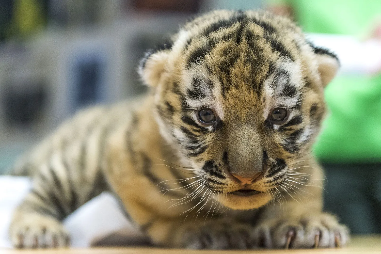 A Siberian tiger (Panthera tigris altaica) cub lies on an examination table during a routine medical check in Veszprem Zoo in Veszprem, 108 kms southwest of Budapest, Hungary, 15 June 2016. The cub is one of the two that were born on zoo premises two weeks earlier. (Photo by Boglarka Bodnar/EPA)