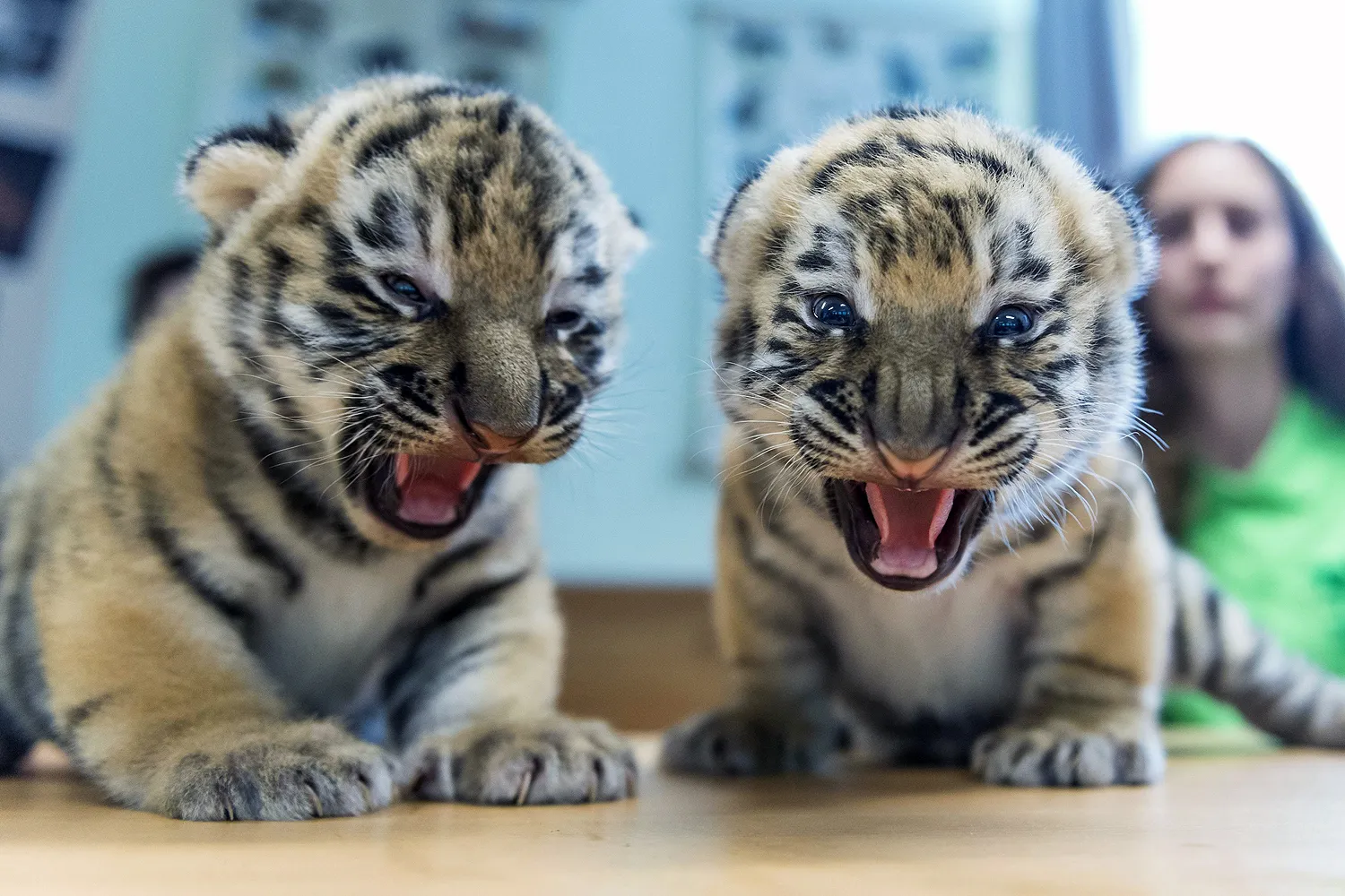 Two Siberian tiger (Panthera tigris altaica) cubs snarl during a routine medical check in Veszprem Zoo in Veszprem, 108 kms southwest of Budapest, Hungary, 15 June 2016. The cubs were born on zoo premises two weeks earlier. (Photo by Boglarka Bodnar/EPA)
