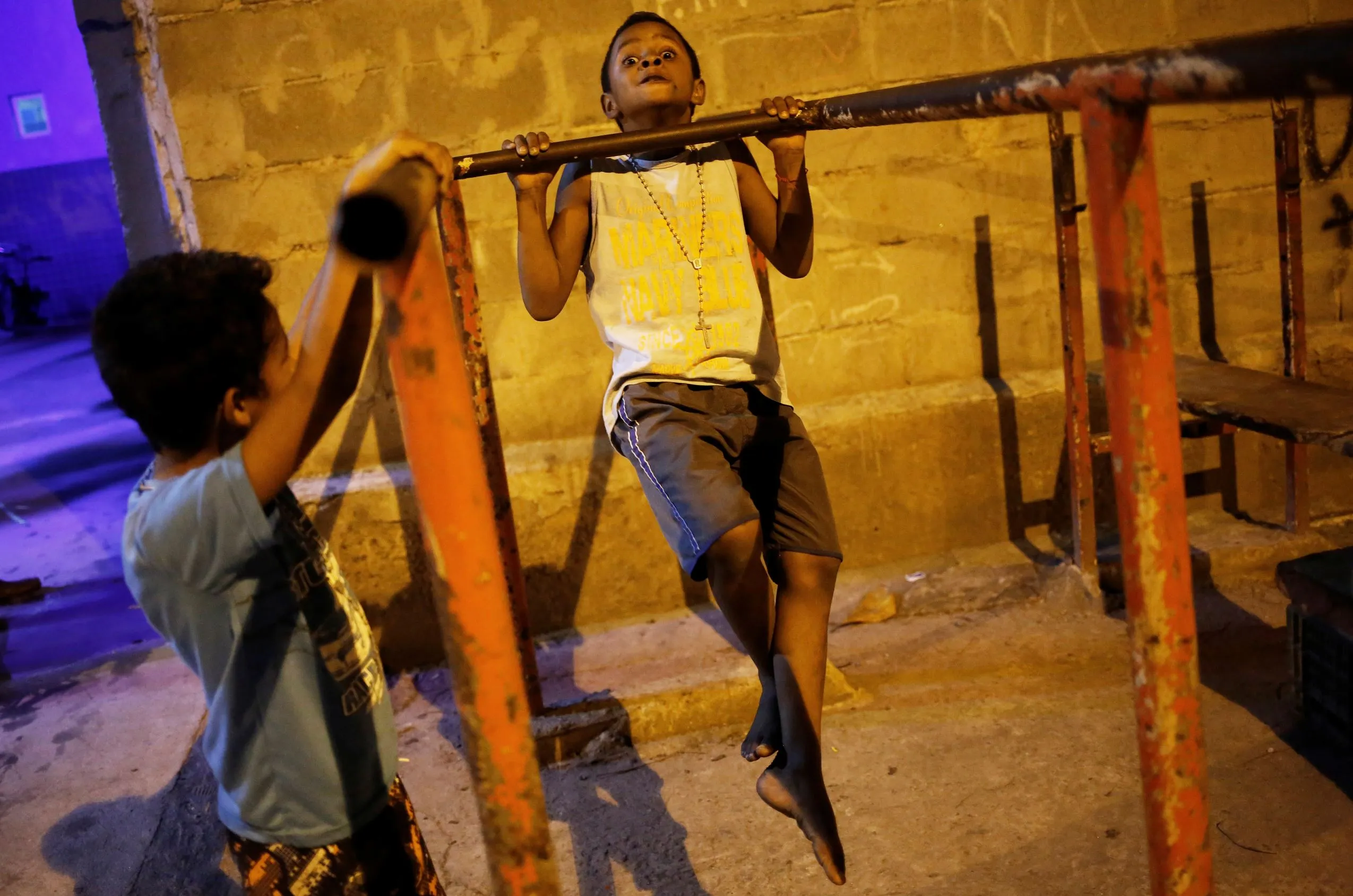 A boy does pull-ups from a metal bar outside the Luta pela Paz (Fight for Peace) boxing school, in the Mare favela of Rio de Janeiro. (Photo by Nacho Doce/Reuters)