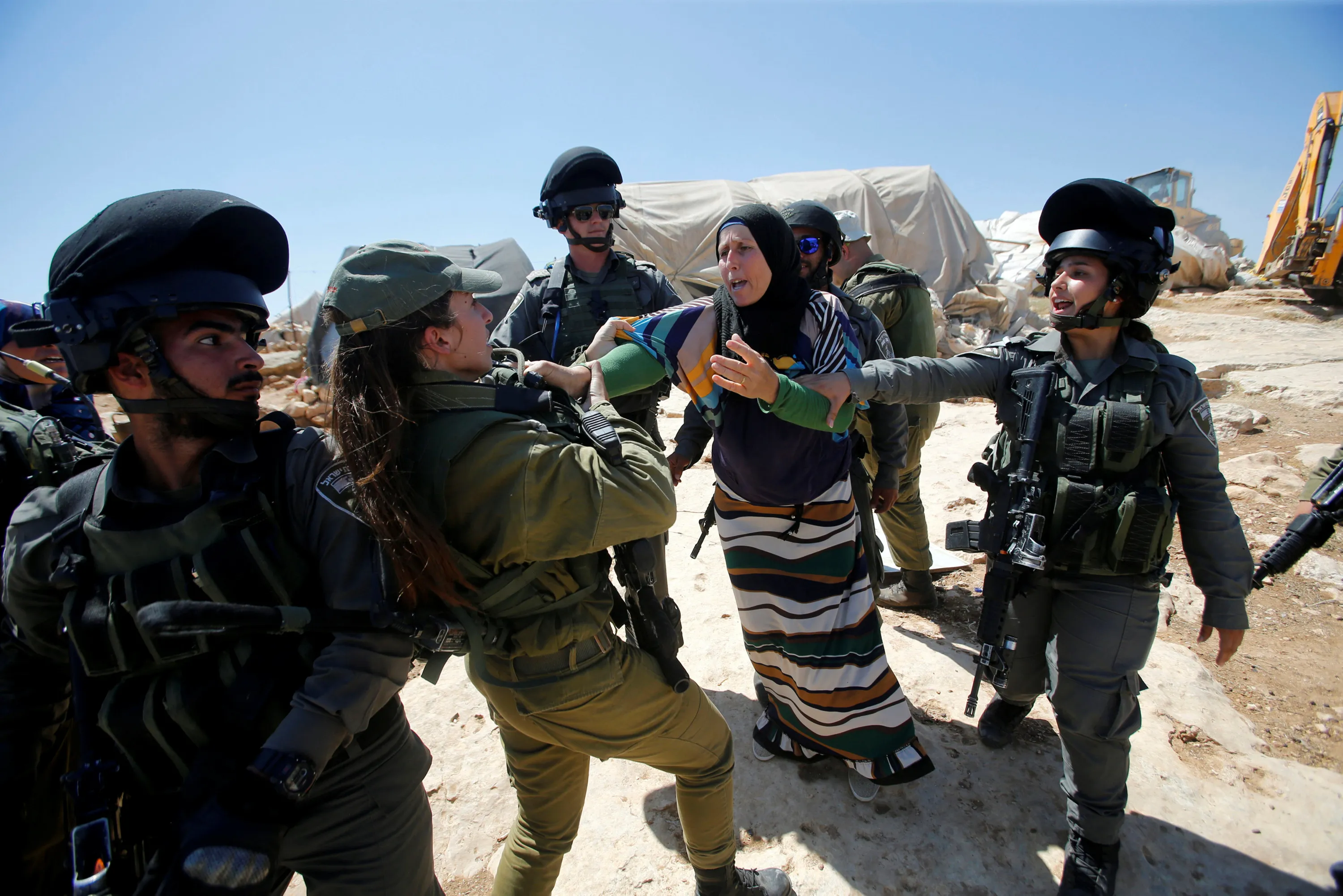 A Palestinian woman scuffles with Israeli troops as they demolish sheds belonging to Palestinians near the West Bank village of Yatta, south of Hebron June 19, 2016. (Photo by Mussa Qawasma/Reuters)
