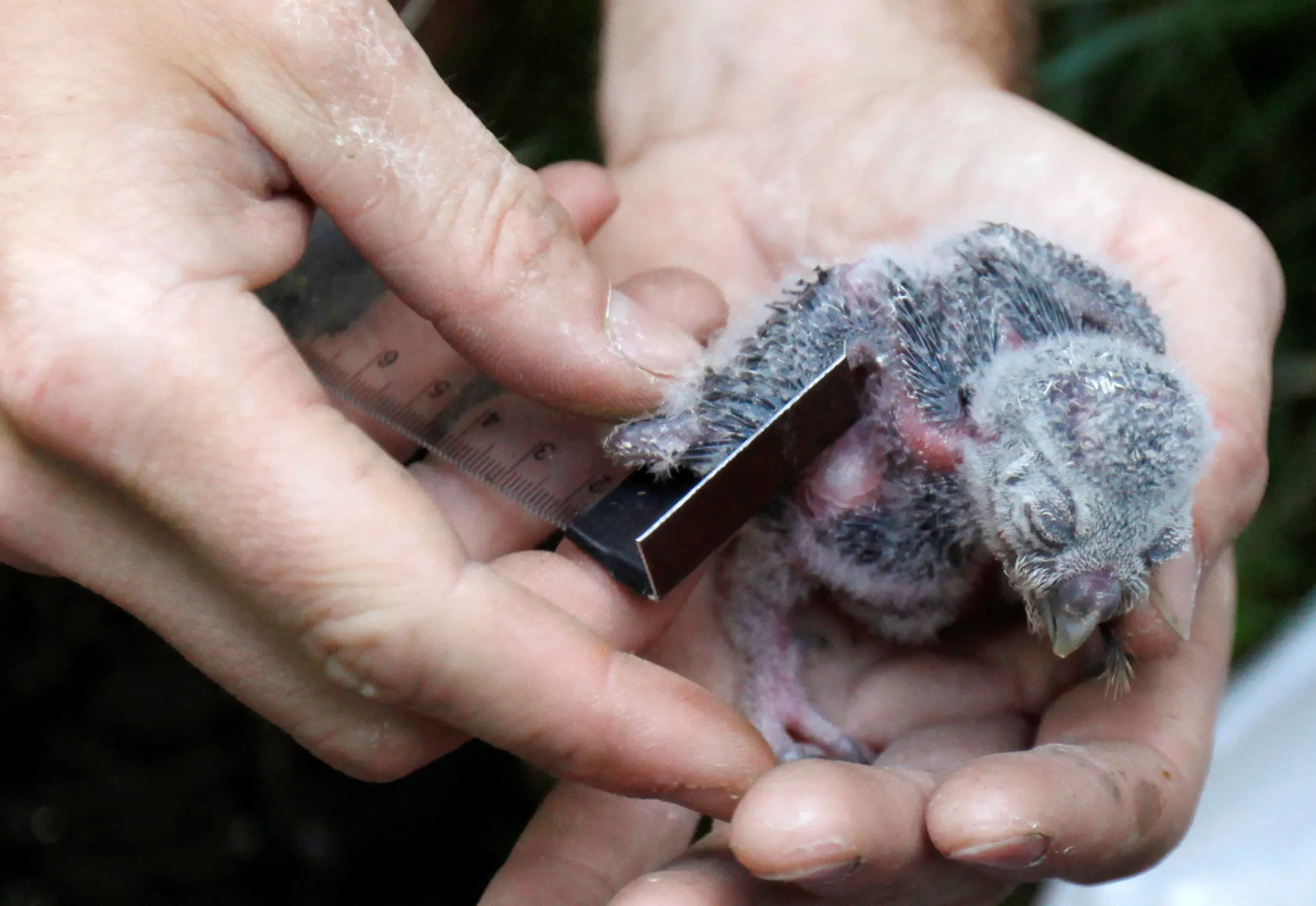 Scientist Jiri Sindelar measures a newly born Boreal owl chick outside the “Smart Nest Box”, which allows the study of birds by using mounted cameras, in a forest near the village of Mikulov, Czech Republic, June 18, 2016. (Photo by David W. Cerny/Reuters)