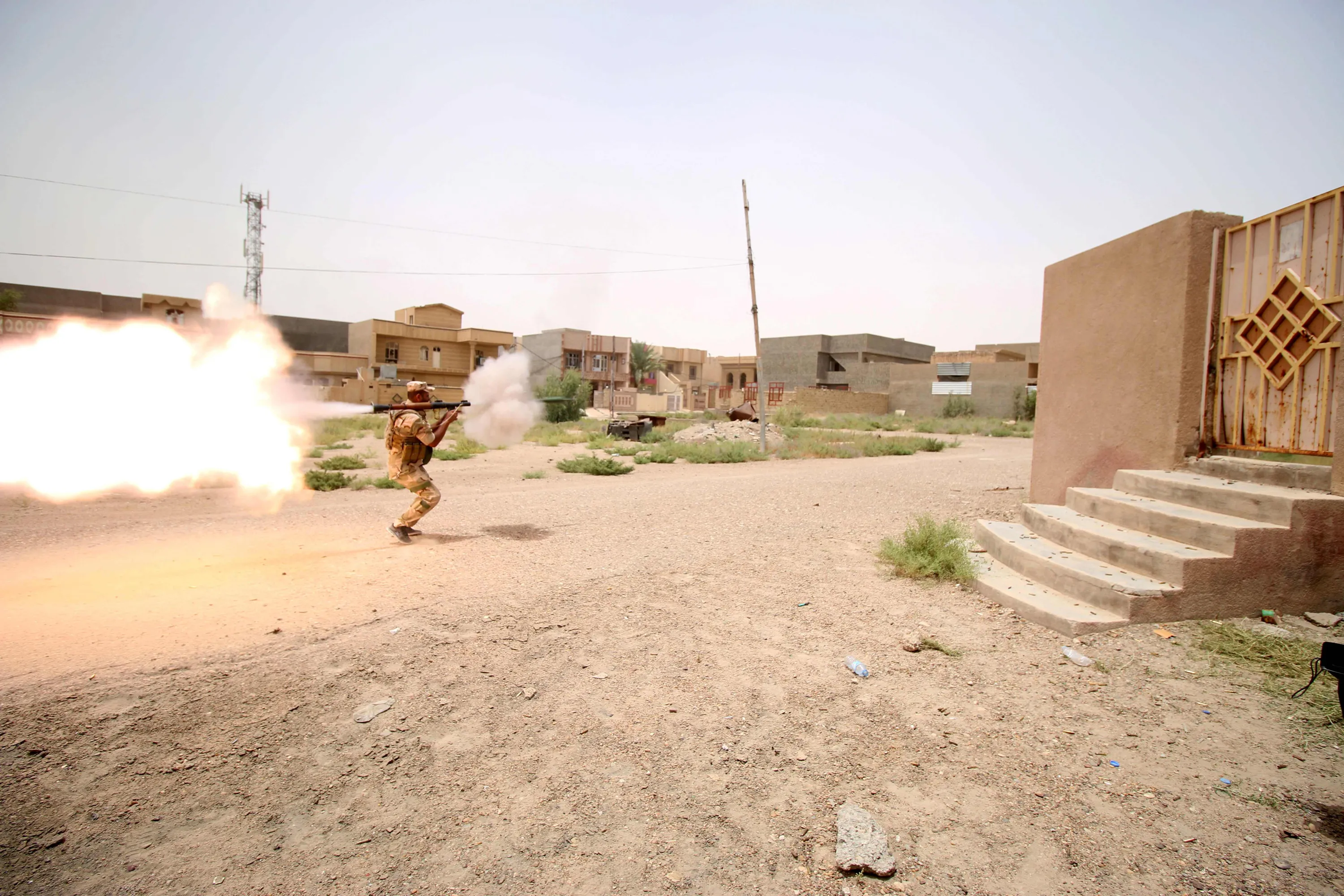 A member of the Iraqi pro-government forces fires a rocket propelled grenade during clashes with Islamic State (IS) group fighters as they try to enter the eastern Askari neighbourhood of Fallujah during a military operation to clear the city of IS fighters still holed up in the former jihadi bastion on June 19, 2016. Despite facing less resistance than expected from IS in Fallujah, an emblematic jihadist stronghold, sniper fire, car bombs and booby traps remained a risk for Iraq's forces as they try to clear central Fallujah of pockets of IS fighters. (Photo by Haidar Mohammed Ali/AFP Photo)