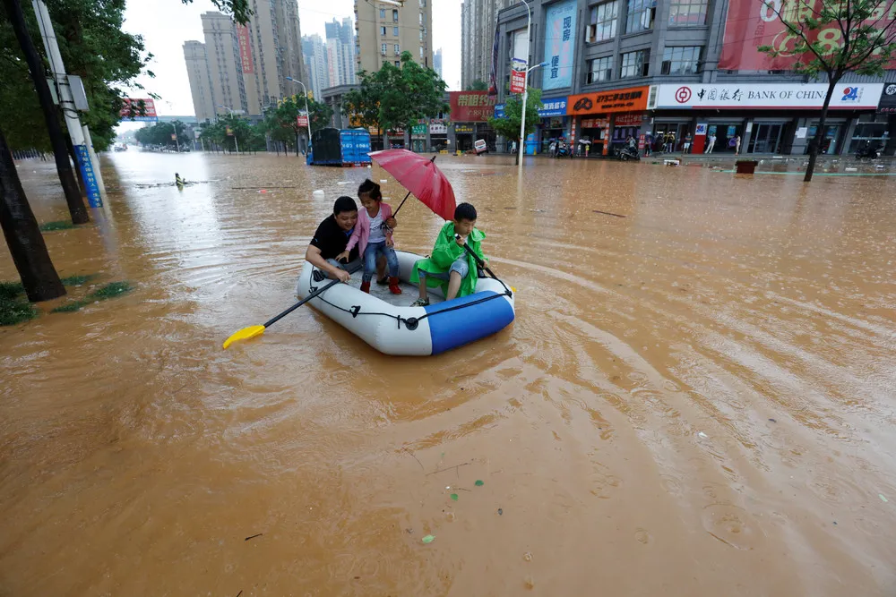 Residents make their way with an inflatable boat through a flooded area in Jiujiang, Jiangxi Province, China, June 19, 2016. (Photo by Reuters/Stringer)