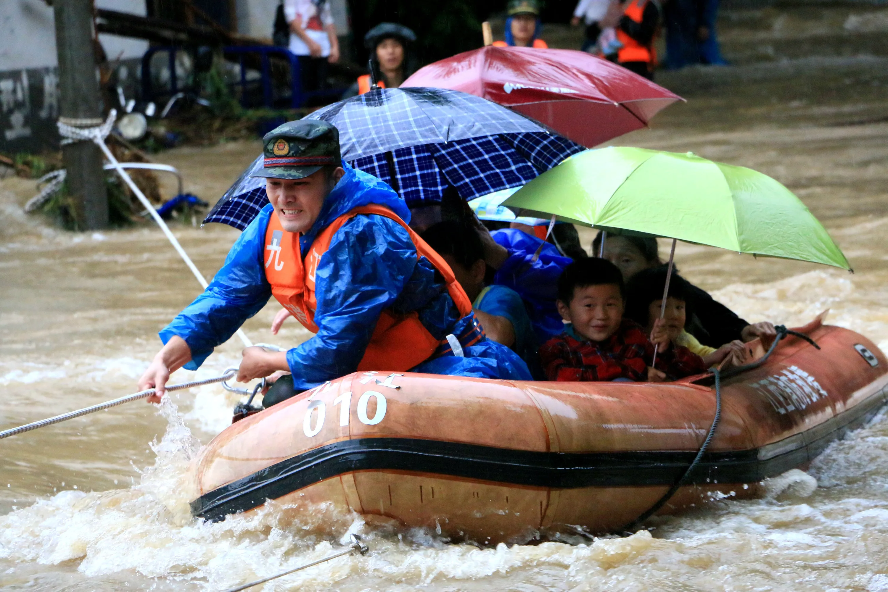 A rescuer grabs a rope to prevent a raft carrying residents from being flushed away as residents are evacuated from a flooded area in Jiujiang, Jiangxi Province, China, June 19, 2016. (Photo by Reuters/Stringer)