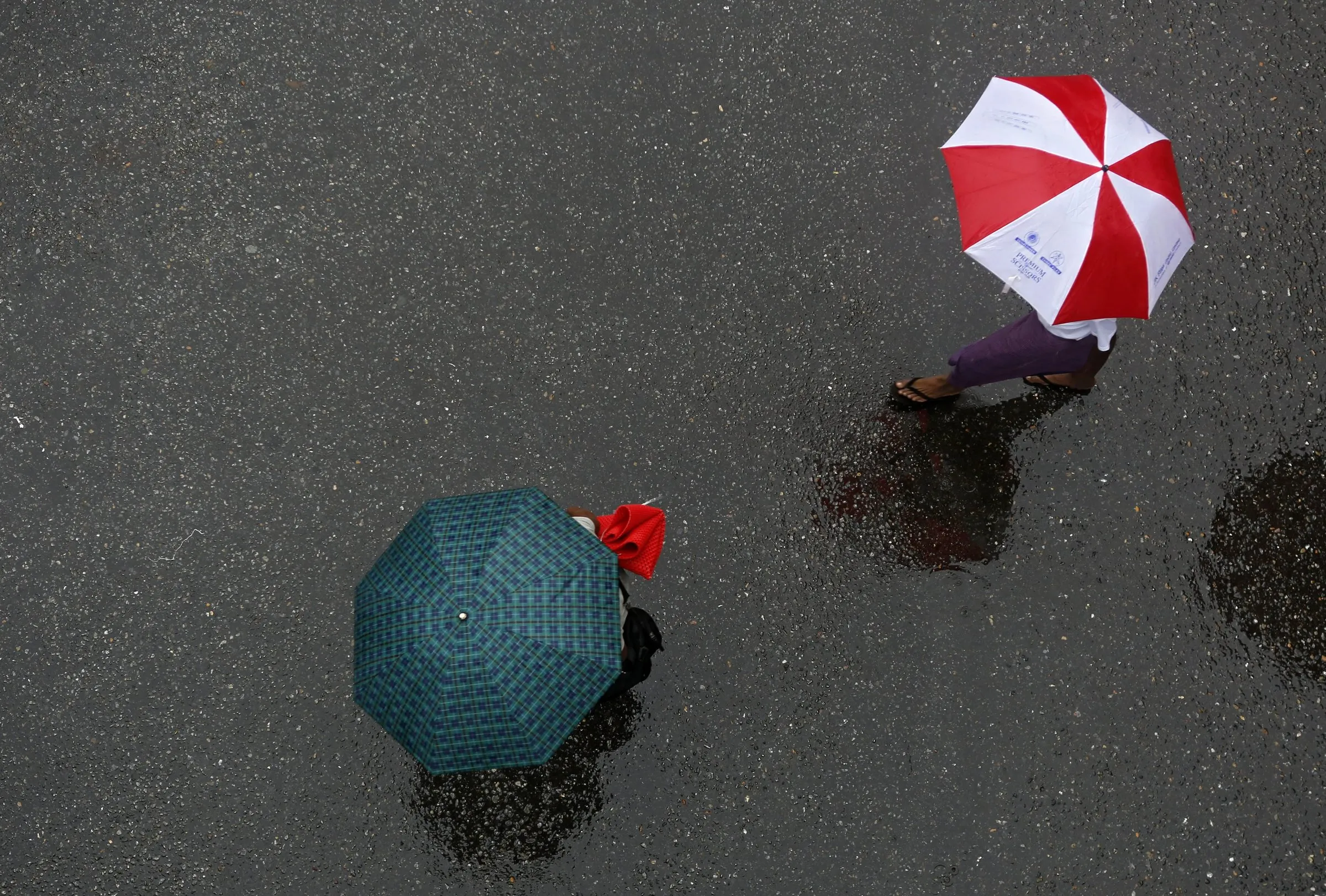 People cross a road as they shelter under umbrellas during heavy rain in Yangon, Myanmar, 24 May 2016. Myanmar this year gets it's early monsoon as cyclone Roanu brought rainfall after suffering recorded extreme temperatures. Myanmar monsoon normally starts at the beginning of June and ends in September. (Photo by Lynn Bo Bo/EPA)