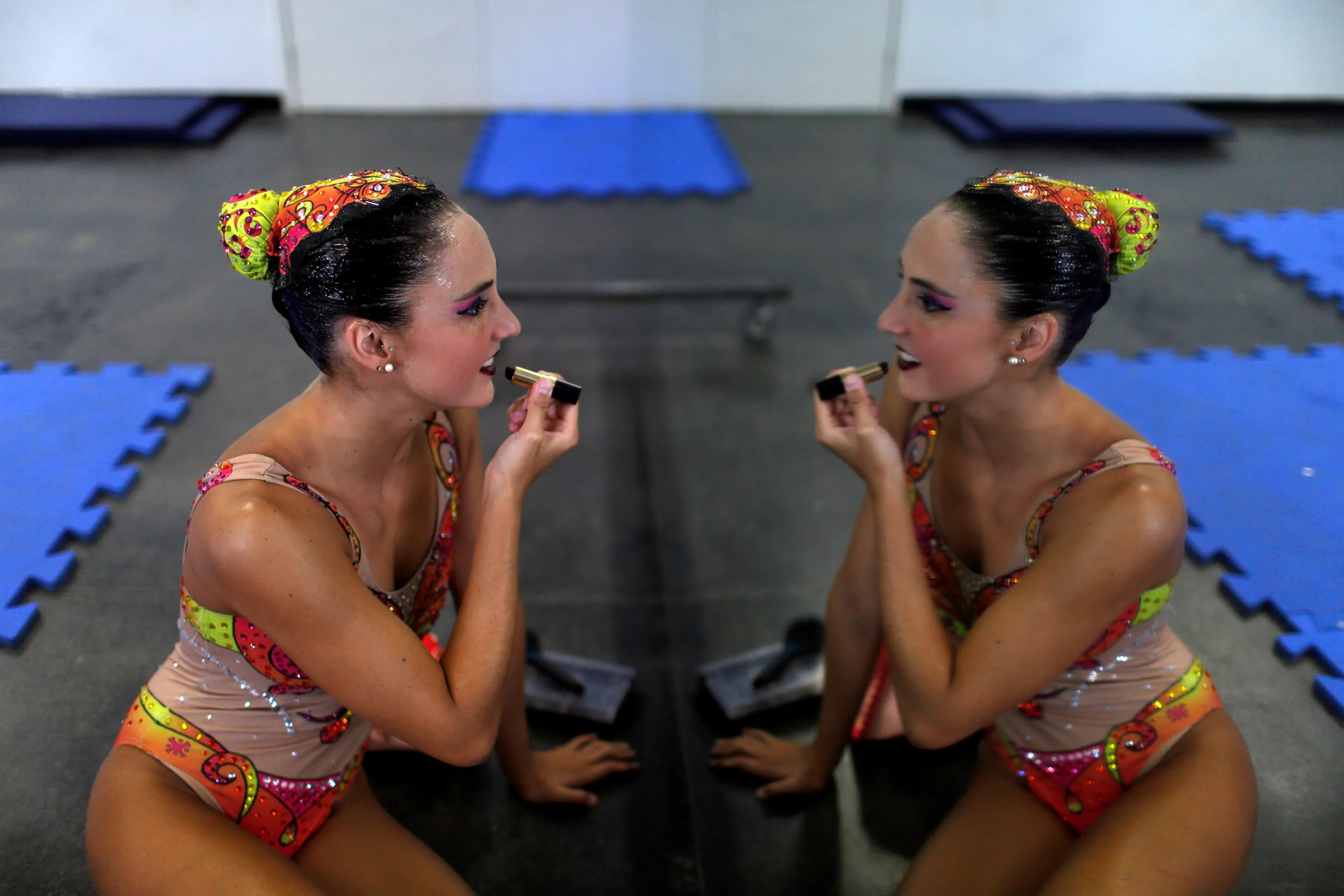 Brazil's synchronised swimmer Luisa Borges puts on her makeup before a training session at the Rio Olympic Park in Rio de Janeiro, Brazil, April 7, 2016. (Photo by Pilar Olivares/Reuters)