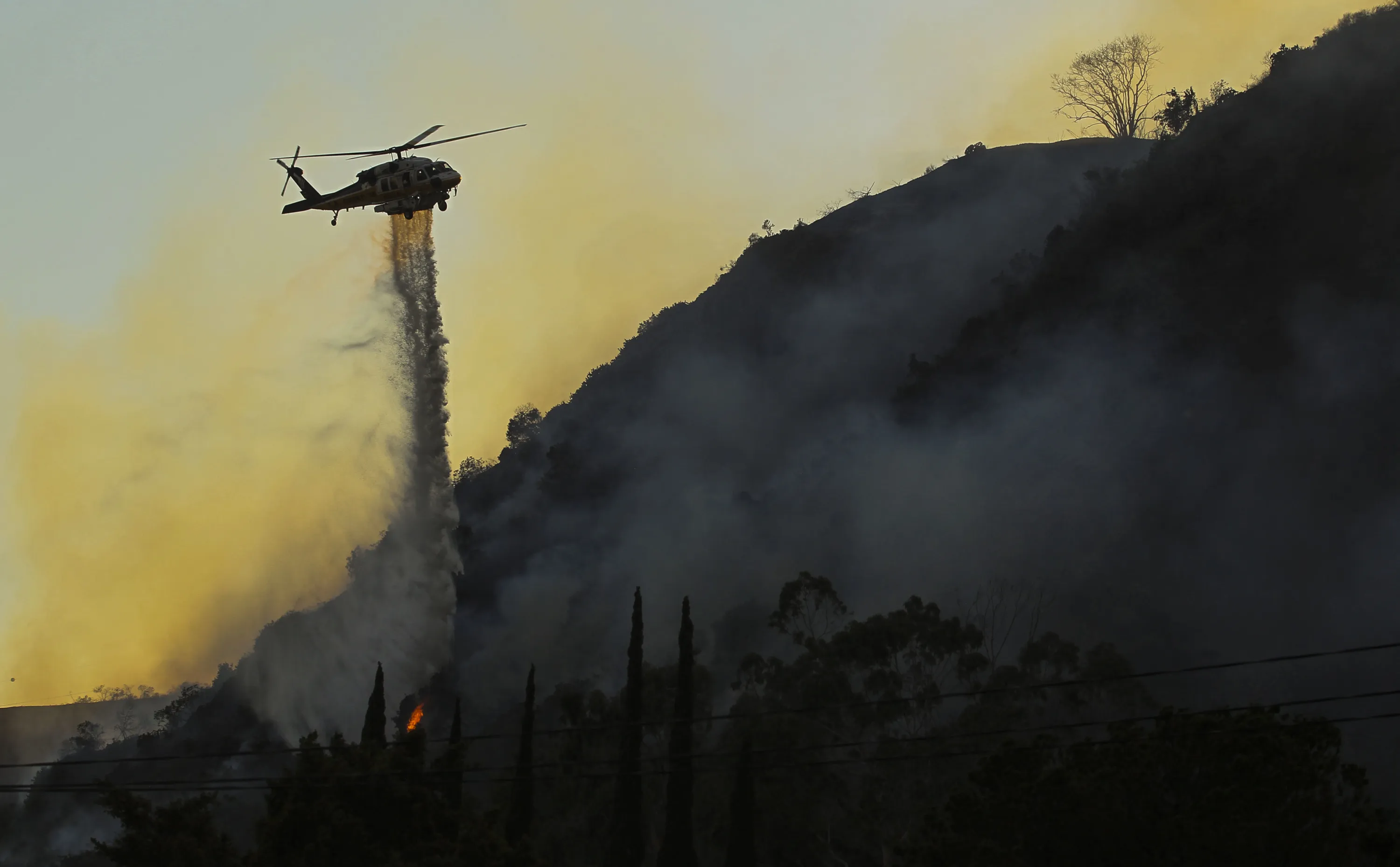 A helicopter makes a drop on a wildfire along a hillside in Duarte, Calif., Monday, June 20, 2016. (Photo by Ringo H.W. Chiu/AP Photo)