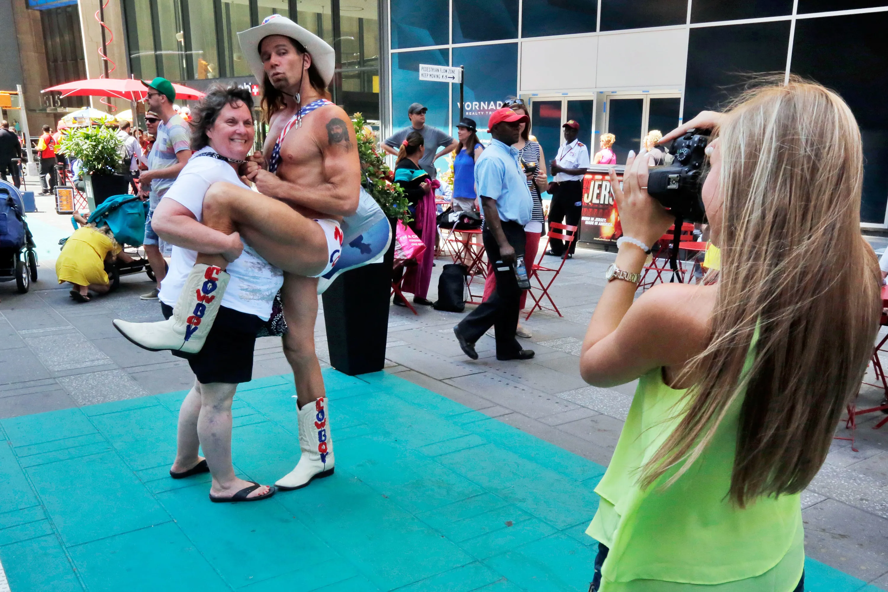 Robert Burck, The Naked Cowboy, poses for photos in one of Times Square's new color-coded designated activity zones, Tuesday, June 21, 2016, in New York. Street performers and costumed characters can be issued summonses or face arrest if they're caught operating outside the eight designated rectangles, under new rules aimed at controlling overly aggressive street performers. Each area is painted teal and measures 8 feet by 50 feet. (Photo by Richard Drew/AP Photo)