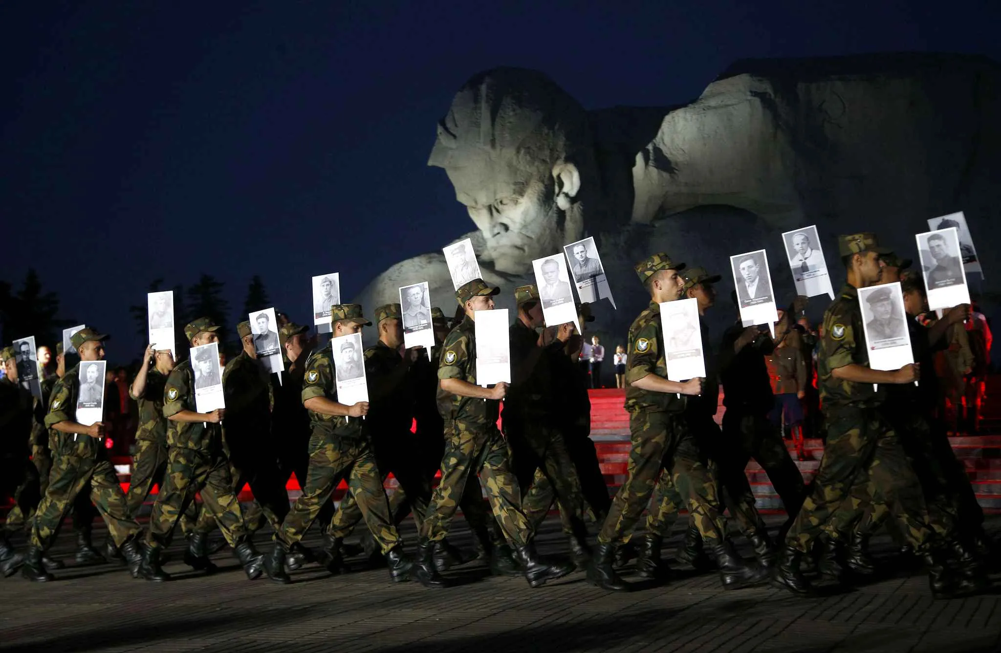Soldiers of Belarusian army carry portraits of fortress' defenders in front of the most important Soviet WWII war monuments during a ceremony to mark the Day of Remembrance and Sorrow, on the 75th anniversary of Germany's attack on the Soviet Union in World War II in the Brest Fortress memorial, 360 kilometers (225 miles) southwest of Minsk, Belarus, early Wednesday, June 22, 2016. The garrison of the 19-century fortress was encircled hours after the Nazis invaded the Soviet Union on June 22, 1941, but the Brest fortress' Soviet defenders held out for 28 days. (Photo by Sergei Grits/AP Photo)