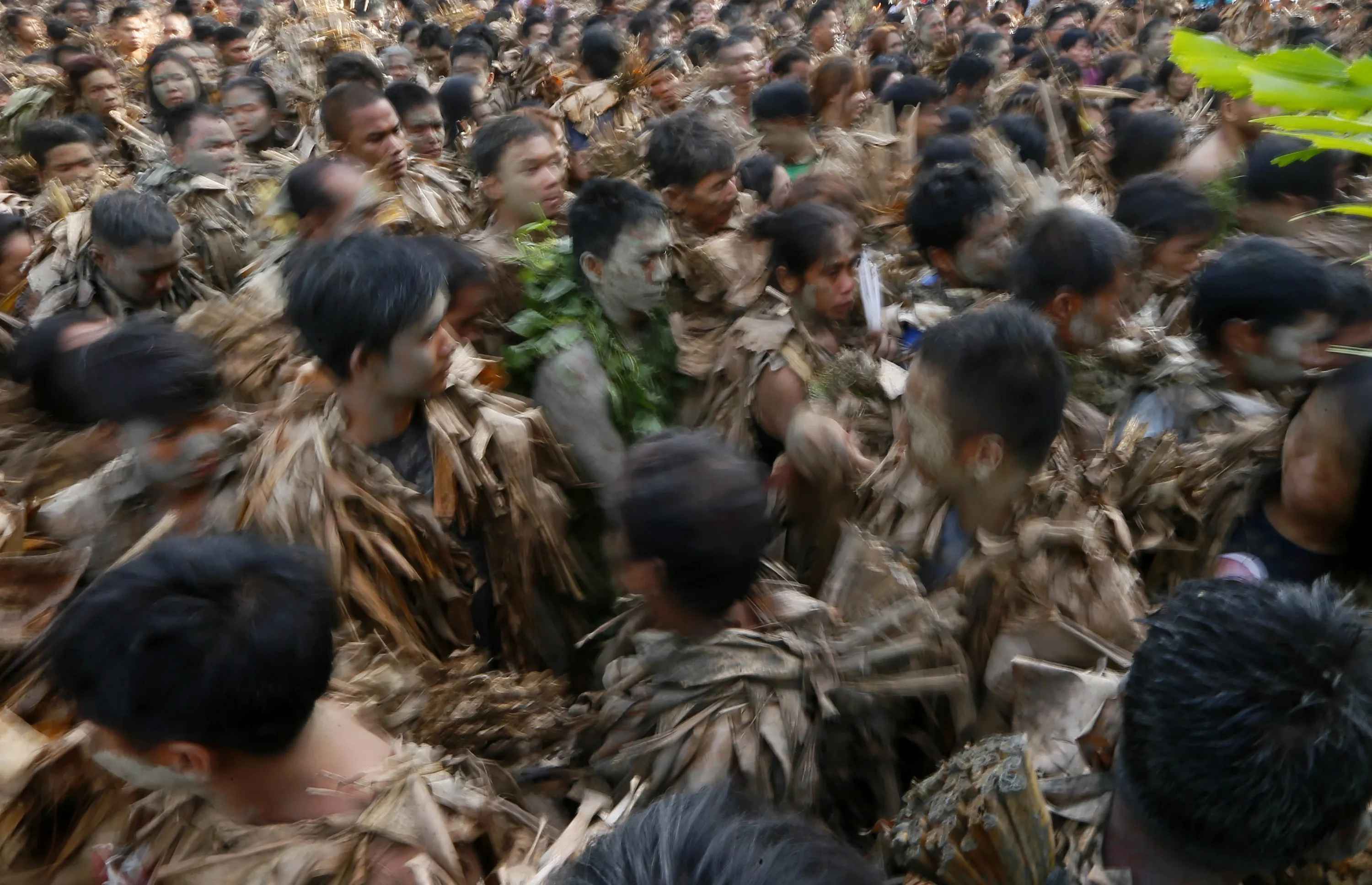 Villagers, donning capes mostly of dried banana leaves and covered in mud, gather for an outdoor mass in a bizarre annual ritual to venerate their patron saint, John the Baptist, Friday, June 24, 2016 at Bibiclat, Aliaga township, Nueva Ecija province in northern Philippines. (Photo by Bullit Marquez/AP Photo)
