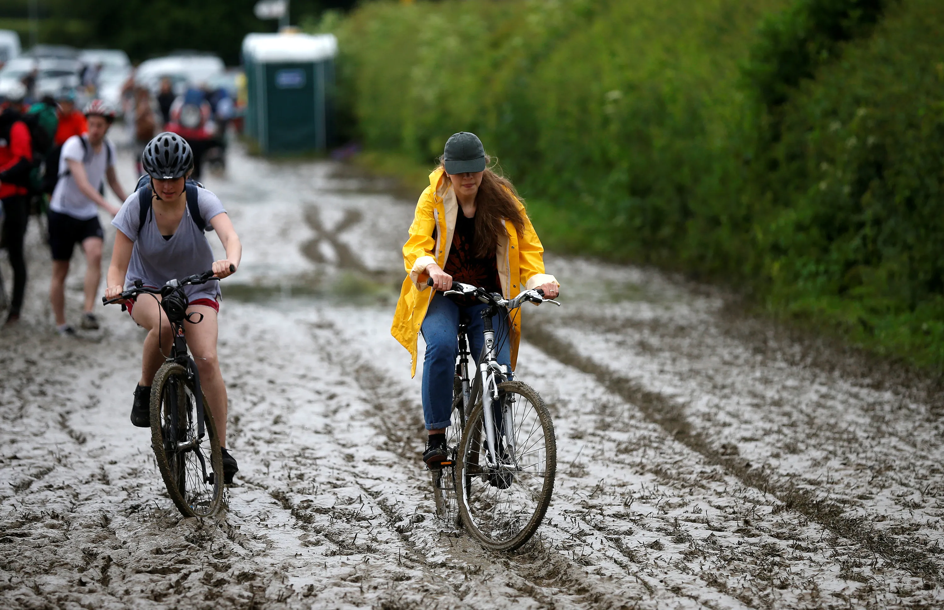Revellers ride their bikes on a muddy road as they arrive at Worthy Farm in Somerset for the Glastonbury Festival, Britain June 22, 2016. (Photo by Stoyan Nenov/Reuters)