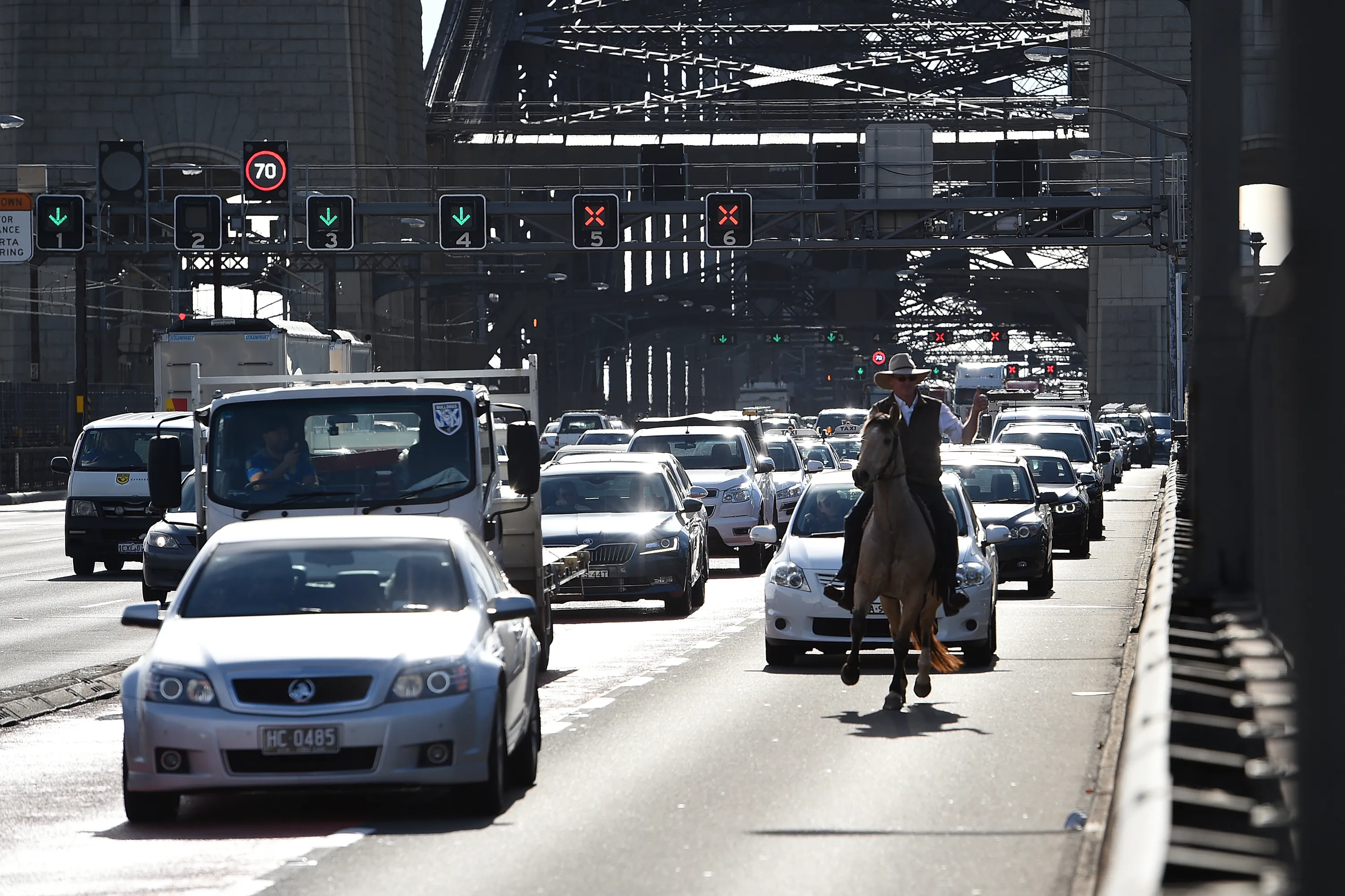 Beef farmer Glenn Morris rides his horse over the Sydney Harbour Bridge to protest against legislation on the clearing of vegetation in Sydney, Australia on June 23, 2016. (Photo by Dan Himbrechts/AAP)