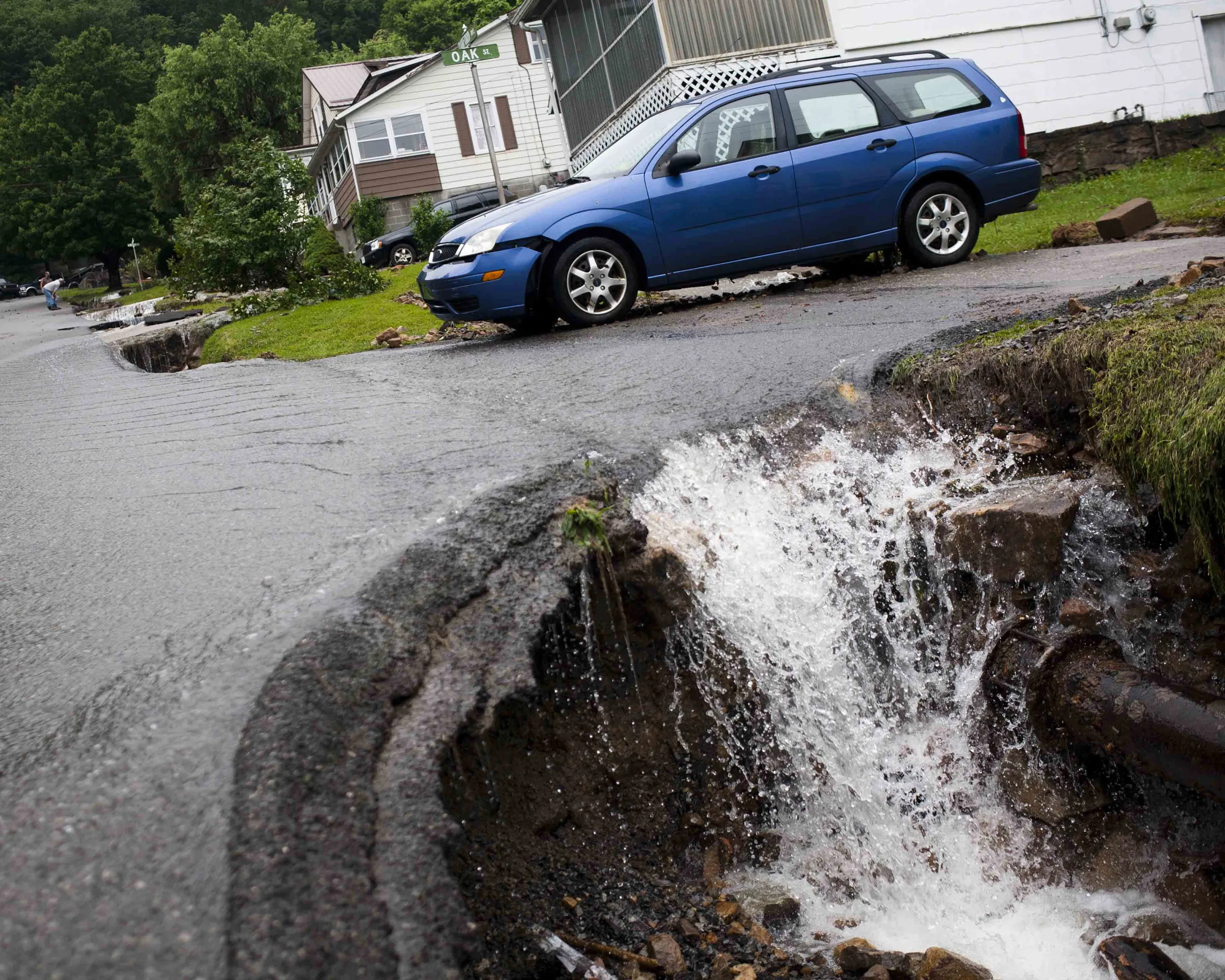 Water rushes past a damaged car and into a chasm of exposed piping created by flood damage on Oarkford Avenue in Richwood, W.Va. on Friday June 24, 2016. (Photo by Christian Tyler Randolph/Charleston Gazette-Mail via AP Photo)