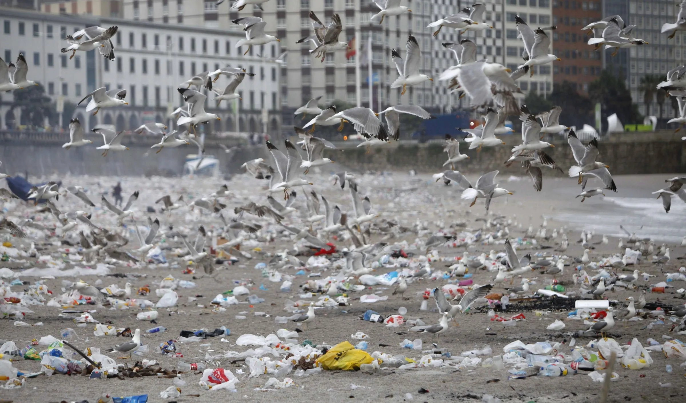 Seagulls fly over the beach of Orzan stuffed full of litter after the celebration of San Juan Fiesta in A Coruna, province of Galicia, early 24 June 2016. Tens of thousands people gathered on the early hours of the 24 June to celebrate the San Juan Fiesta, when people around the country gather around bonfires on a traditional fiesta that started being a pagan celebration to welcome the start of summer and was later adapted by Christianity becoming a religious tradition to celebrate the birth of John the Baptist. (Photo by EPA/Cabalar)