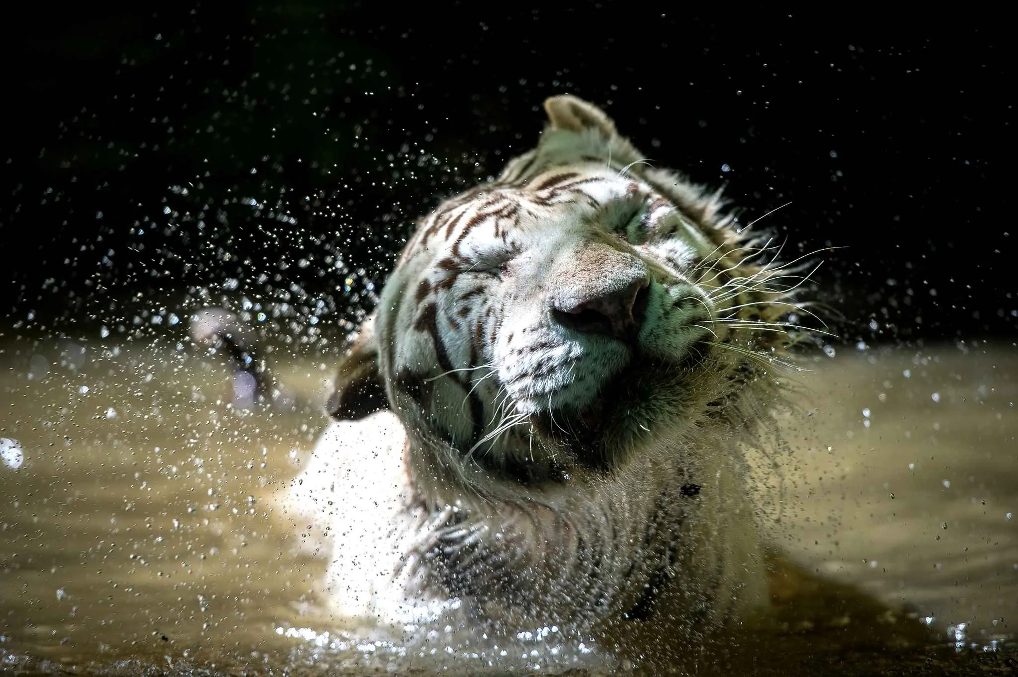 A white tiger shakes off water while swimming at the Beauval Zoo in Saint-Aignan, near Tours, on June 23, 2016. (Photo by Guillaume Souvant/AFP Photo)