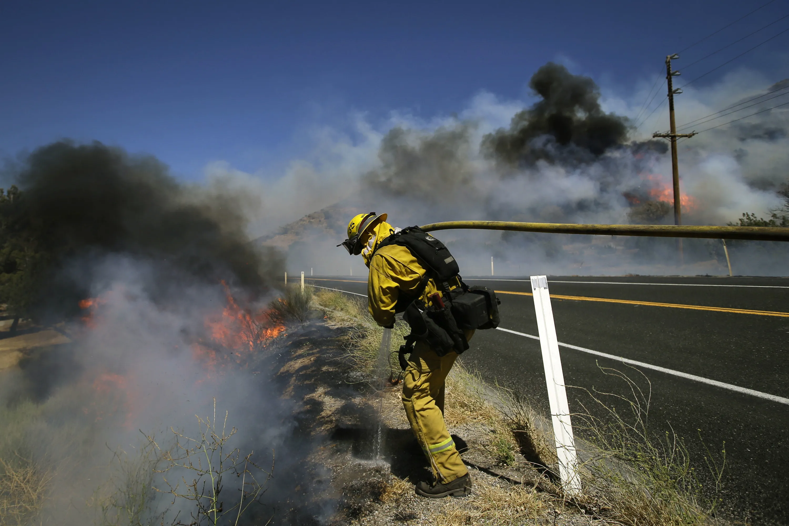 A firefighter carries a water hose to put out a wildfire burning along Highway 178 near Lake Isabella, Calif., Friday, June 24, 2016. (Photo by Jae C. Hong/AP Photo)