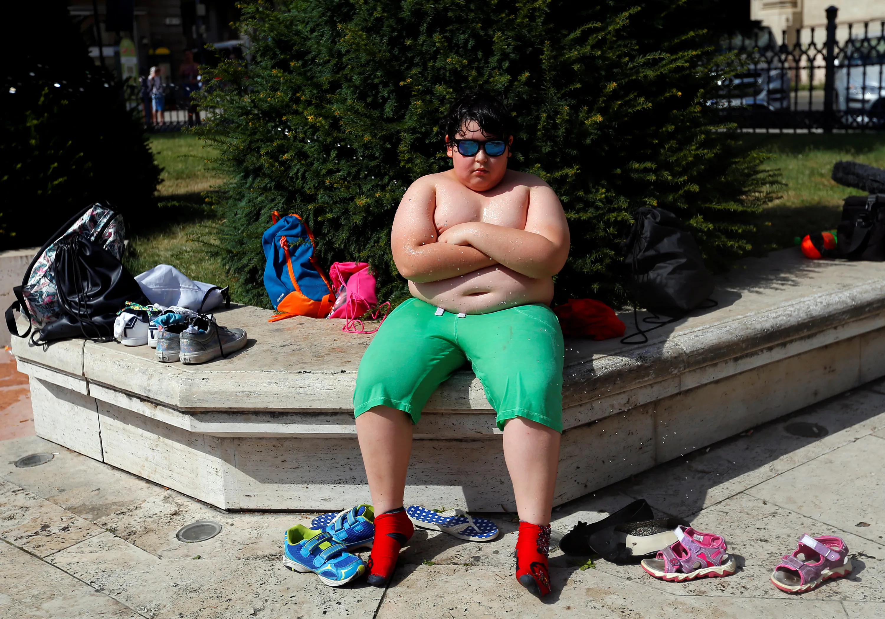 A boy takes a break from a water fight in the centre of Budapest, Hungary, June 25, 2016. (Photo by Laszlo Balogh/Reuters)