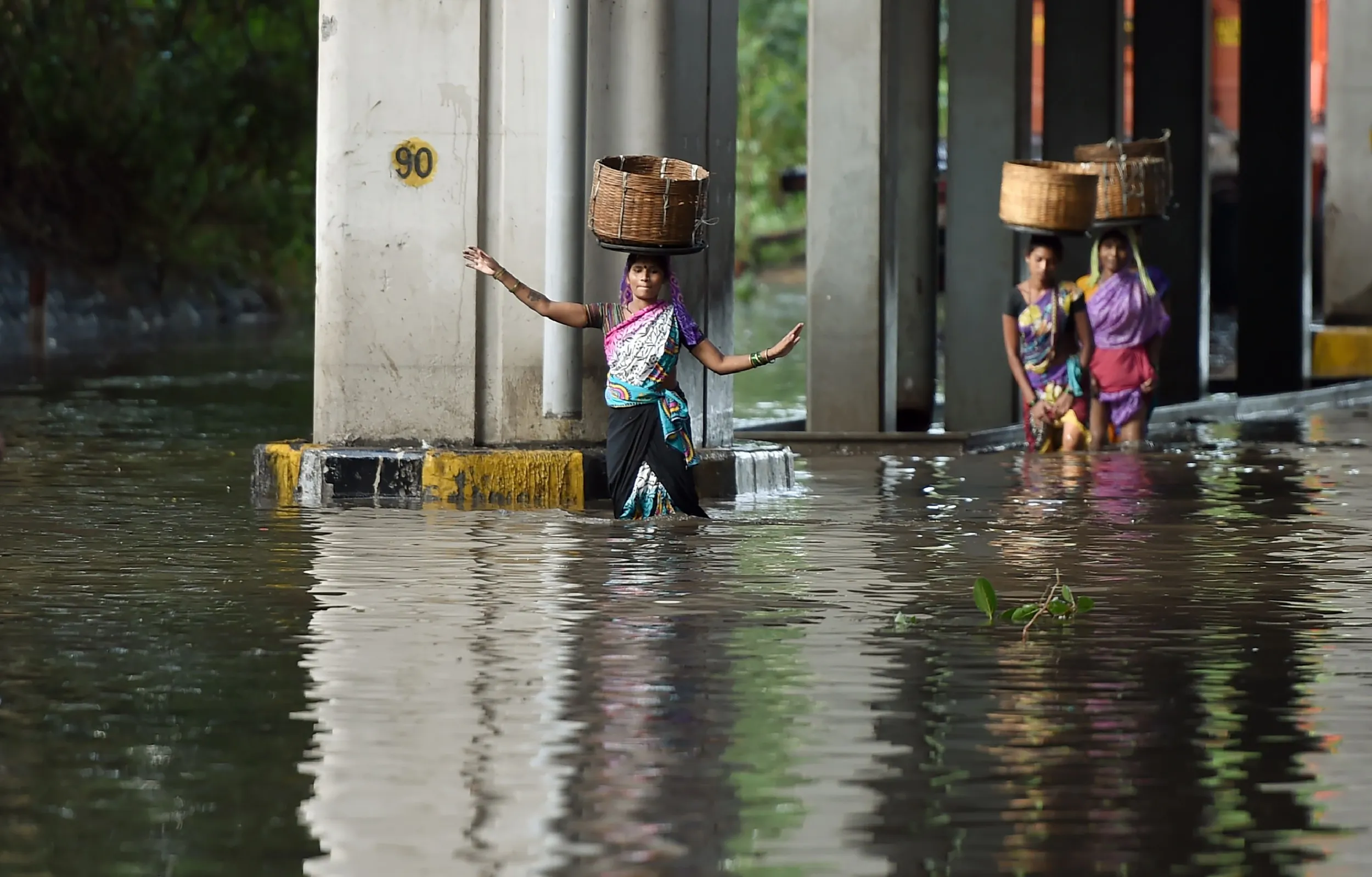 Indian pedestrians balance baskets on their heads as they wade through a flooded street after heavy monsoon rain showers in Mumbai on June 21, 2016. (Photo by Punit Paranjpe/AFP Photo)