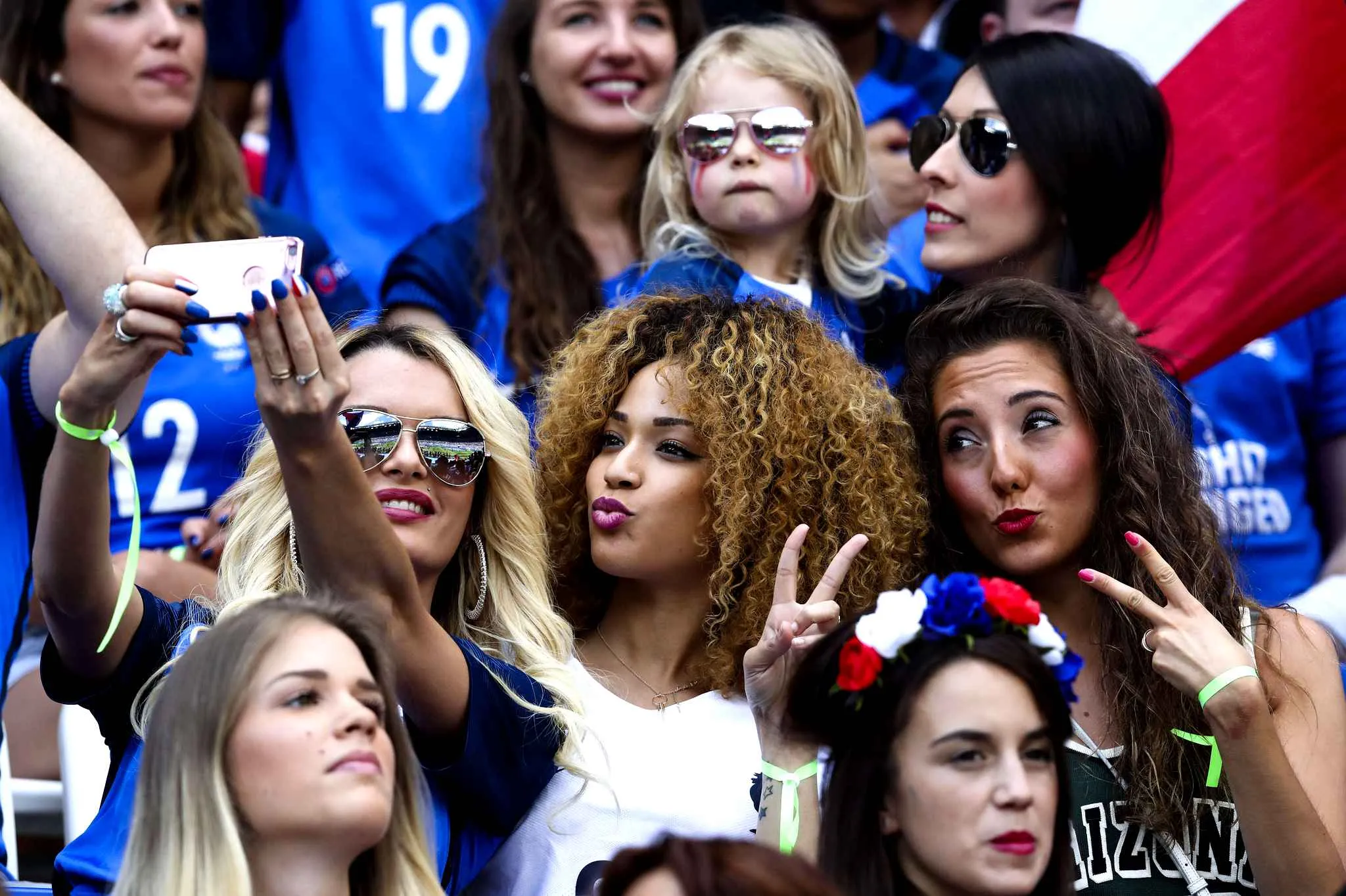 Ludivine Payet, left, wife of France's Dimitri Payet, poses for a photo with others on the stands during the Euro 2016 round of 16 soccer match between France and Ireland, at the Grand Stade in Decines-Charpieu, near Lyon, France, Sunday, June 26, 2016. (Photo by Thanassis Stavrakis/AP Photo)