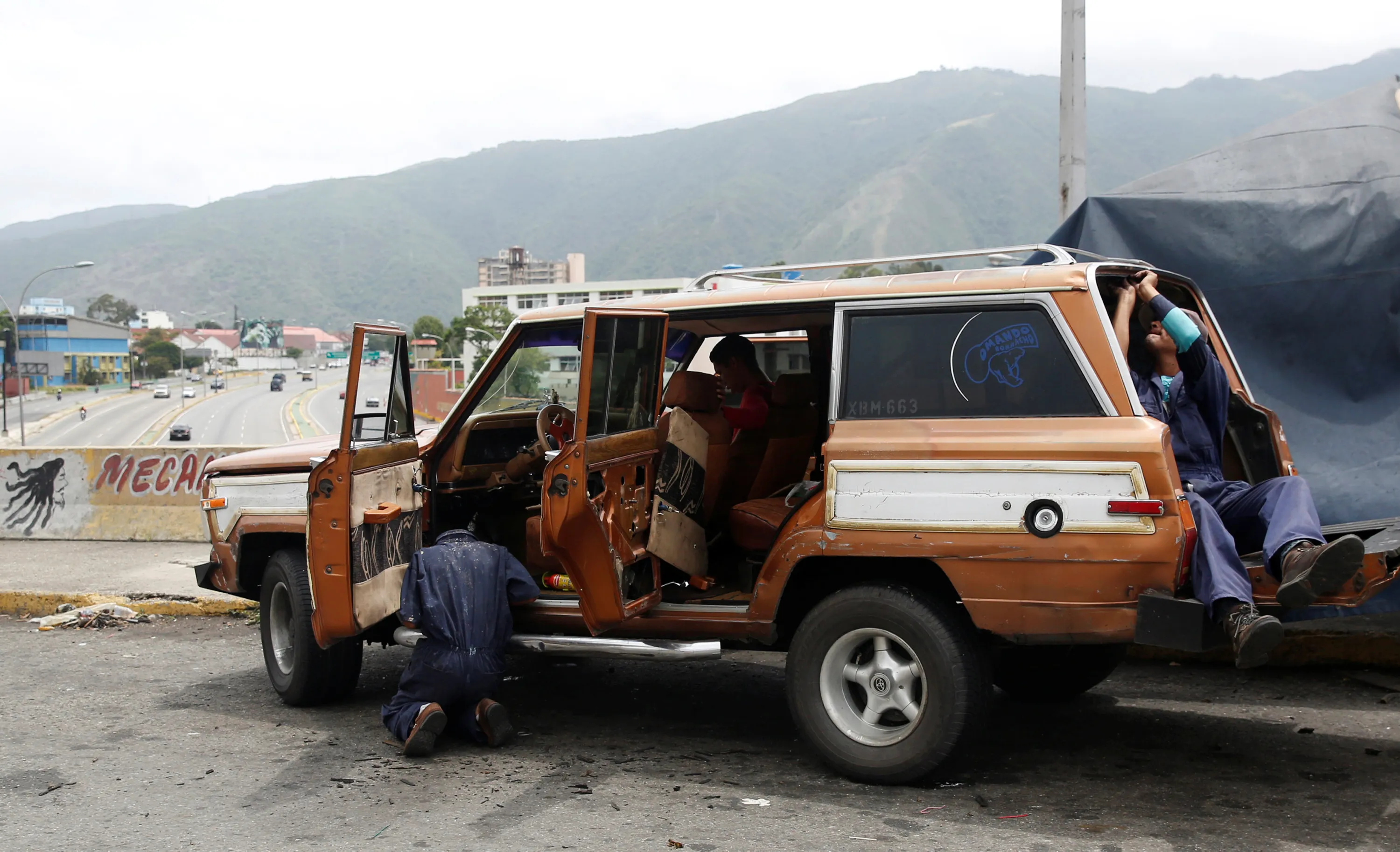 People repair a car in a street in Caracas, Venezuela, June 25, 2016. (Photo by Marco Bello/Reuters)