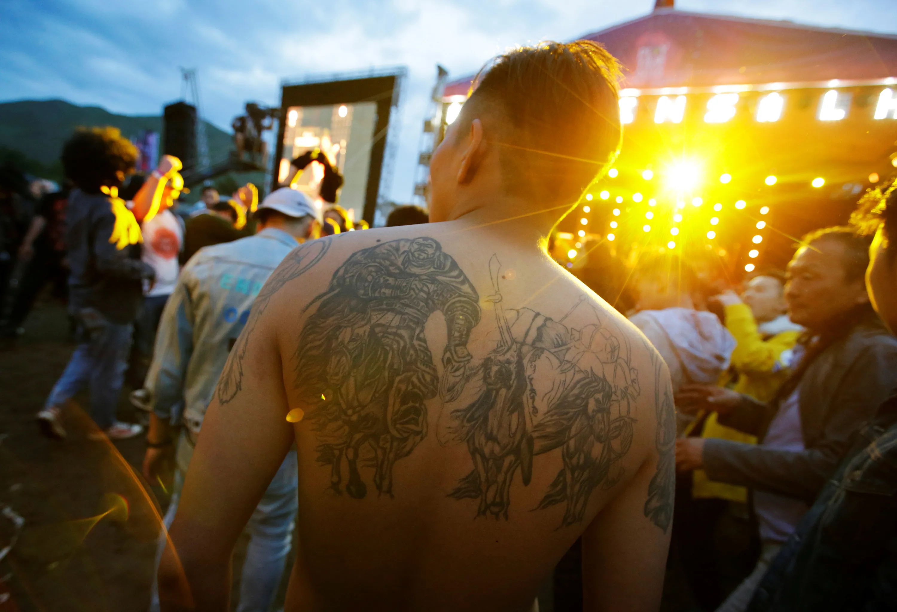A reveller with a tattoo in his back attends the Play Time 2016 music festival on the outskirts of Ulaanbaatar, Mongolia, June 26, 2016. (Photo by Jason Lee/Reuters)