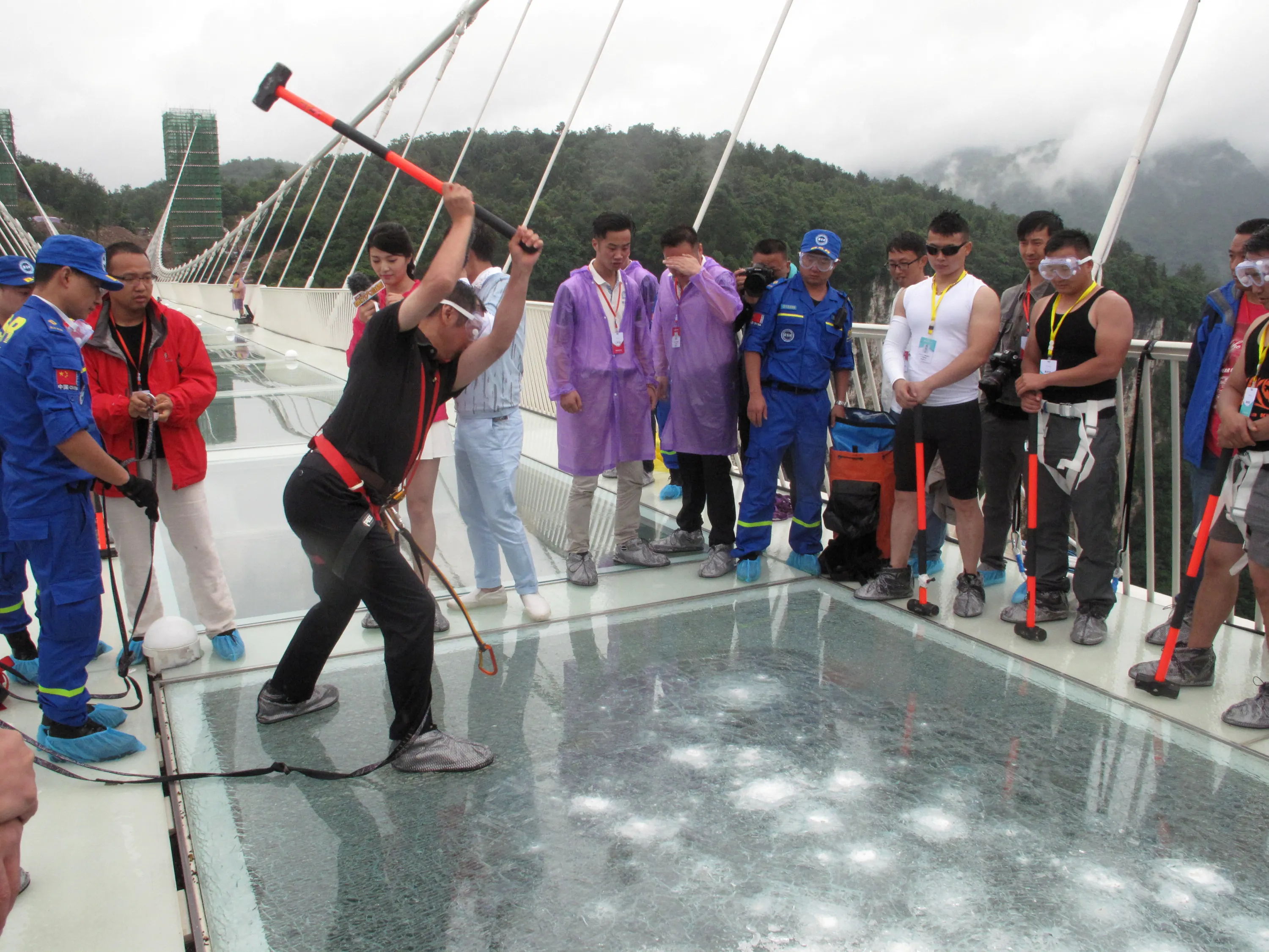 A man strikes a hammer against a 430-meter-long glass-bottom bridge during a safety test ceremony, in Zhangjiajie, Hunan province, China, June 25, 2016. Picture taken June 25, 2016. (Photo by Jimmy Guan/Reuters)