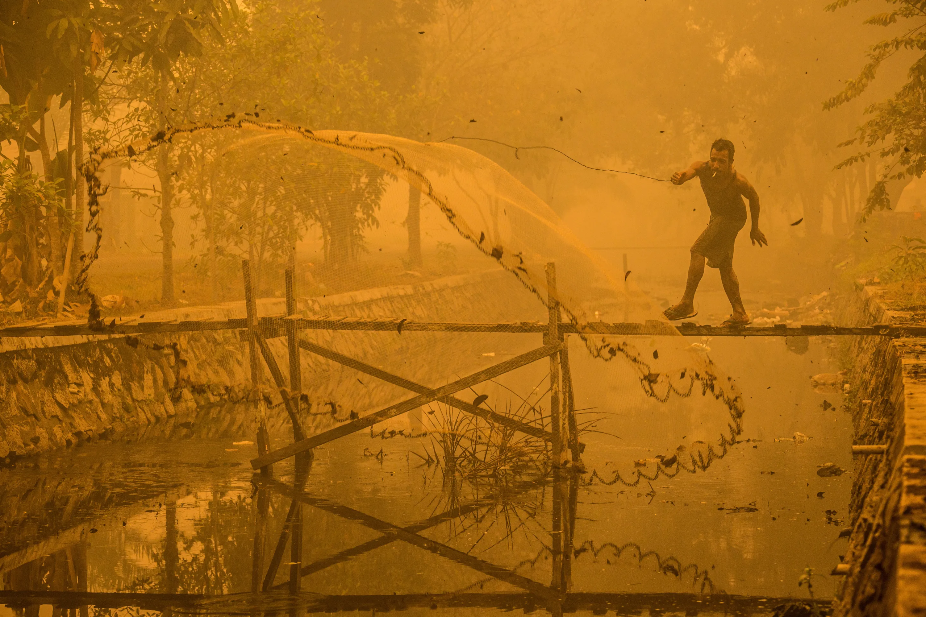 Shortlisted: Björn Vaughn. Slamet is a builder in Palangka Raya, Central Kalimantan, Indonesia. All construction work had stopped due rampant peat fires blanketing the region in a toxic smog. He casts his net into a polluted canal, hoping to make a catch. “Better a dirt fish than no fish at all!” he says. (Photo by Björn Vaughn/2016 EPOTY)