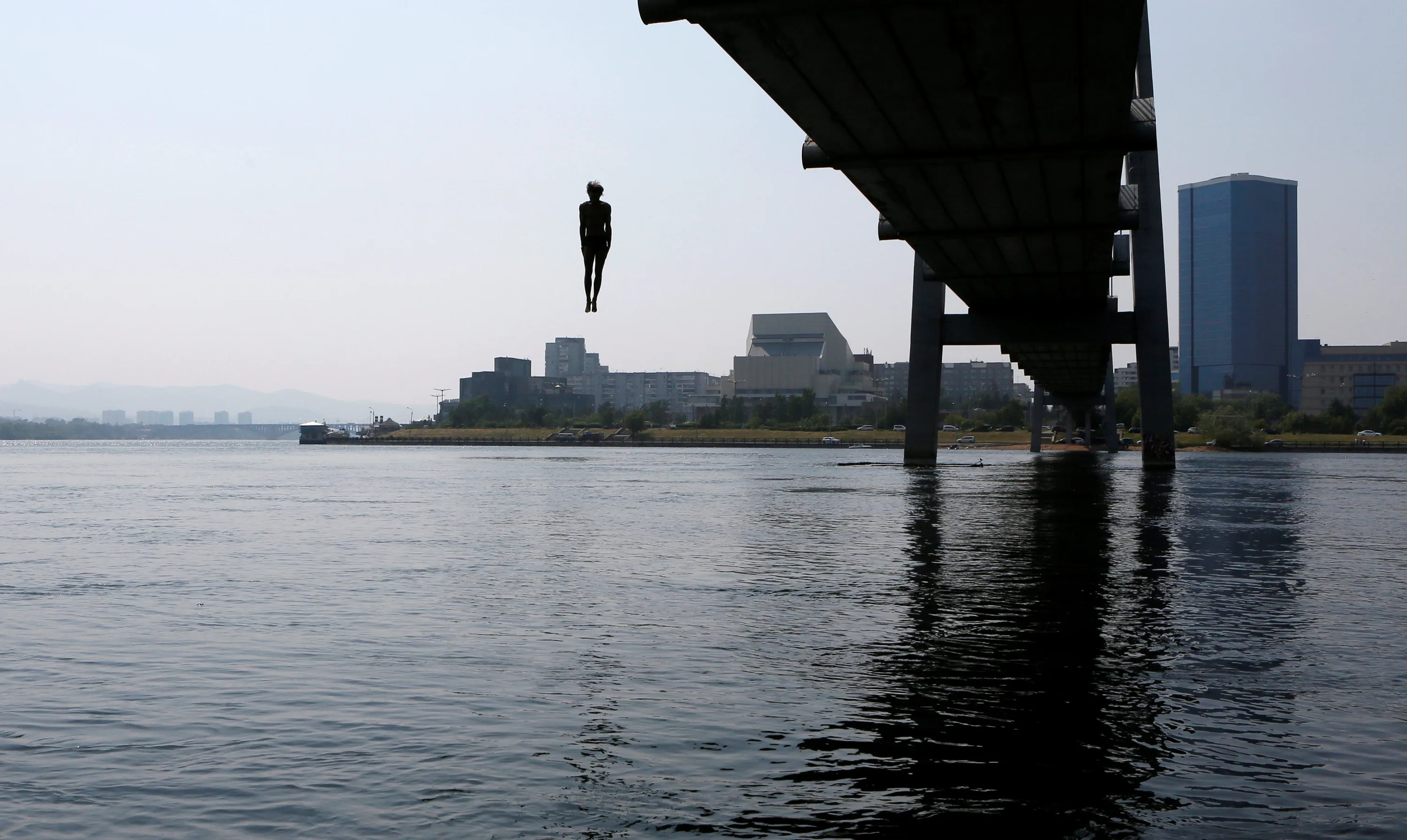 A man jumps from a 12-metre-high footbridge into the waters of the Yenisei river on a hot summer day in the Siberian city of Krasnoyarsk, Russia, June 28, 2016. (Photo by Ilya Naymushin/Reuters)