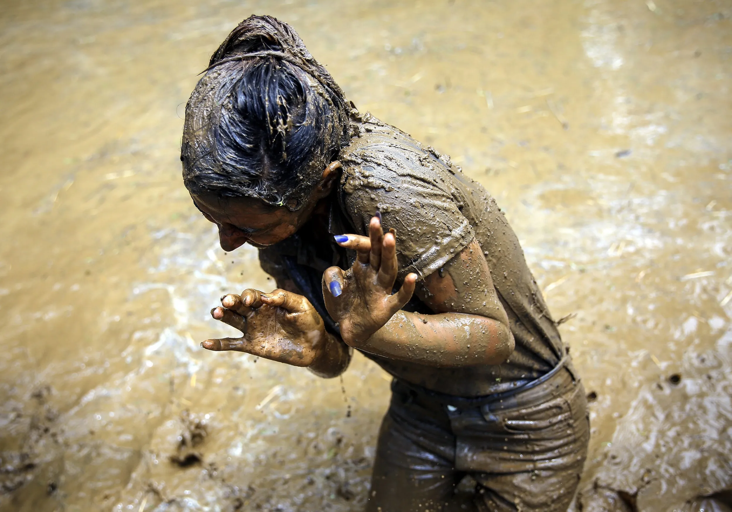 Nepalese students of Himalayan agriculture college play in mud water in a paddy field to celebrate the National Paddy Day in Badegaun village, Lalitpur, Nepal, 29 June 2016. More than 100 students and teachers of Himalayan agriculture college participated in the National paddy day by planting rice and playing in mud water as Nepal is celebrating National Paddy Day with various event. On this day, known as Asar Pandra, farmers begin the annual rice planting season and mark the day with various festivities such as preparing rice meals with muddy water, mud being a symbol for a prosperous season. The agricultural sector contributes about 60 per cent to Nepal's gross domestic product. (Photo by Narendra Shrestha/EPA)