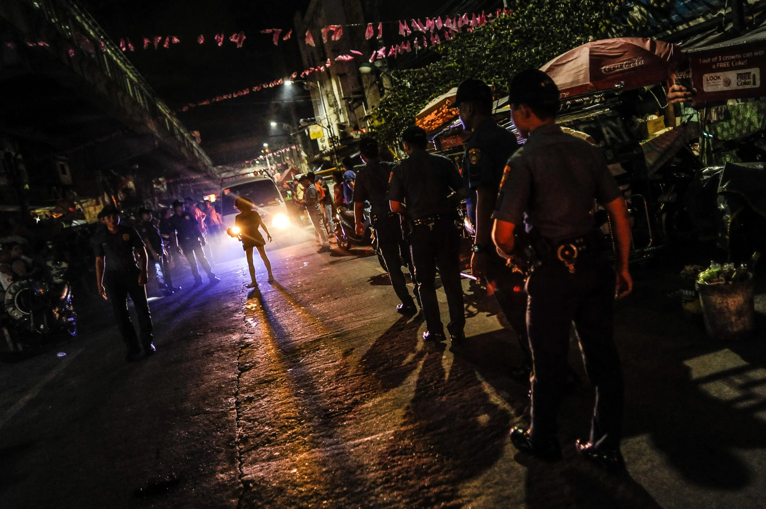 Police patrol a shanty community at night during curfew, June 8, 2016, in Manila, Philippines. (Photo by Dondi Tawatao/Getty Images)