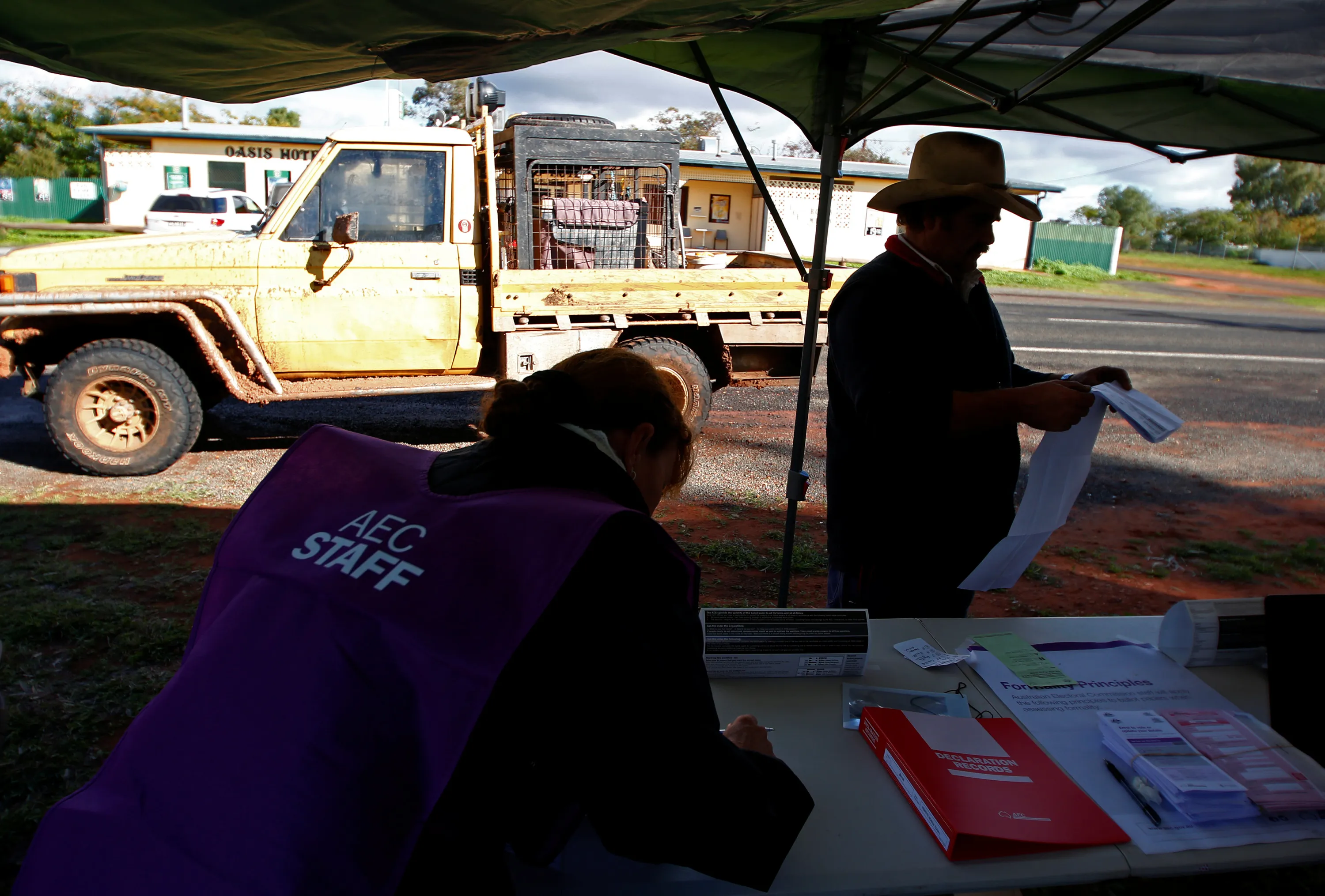 Farmer Darrell Peirpoint holds his Australian Senate ballot paper as assistant Heather McInerney prepares an official form at the remote voting station in the western New South Wales outback town of Enngonia, Australia, June 22, 2016. (Photo by David Gray/Reuters)