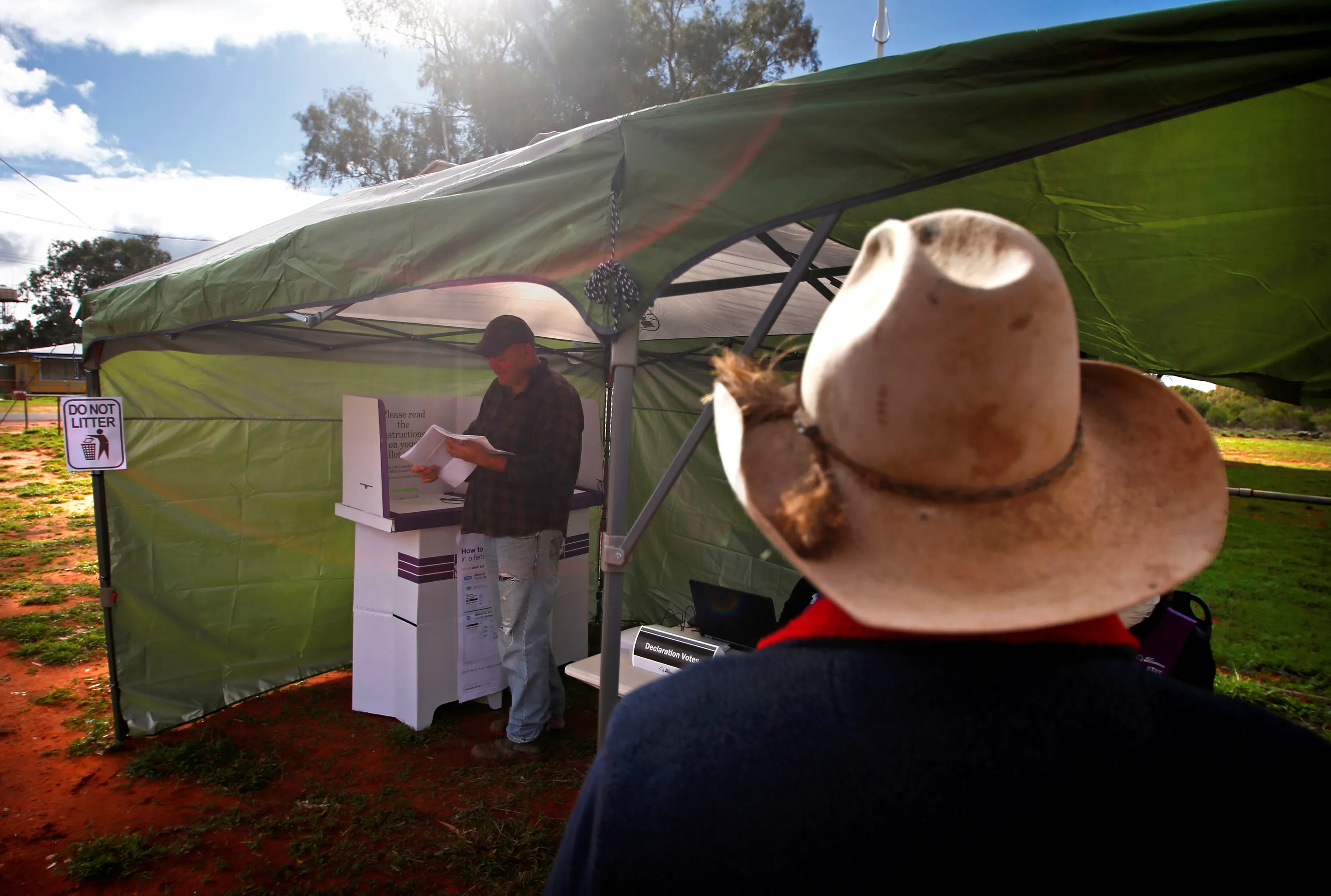 Farmer Darrell Peirpoint watches as a local resident votes in the remote voting station in the western New South Wales outback town of Enngonia, Australia, June 22, 2016. (Photo by David Gray/Reuters)