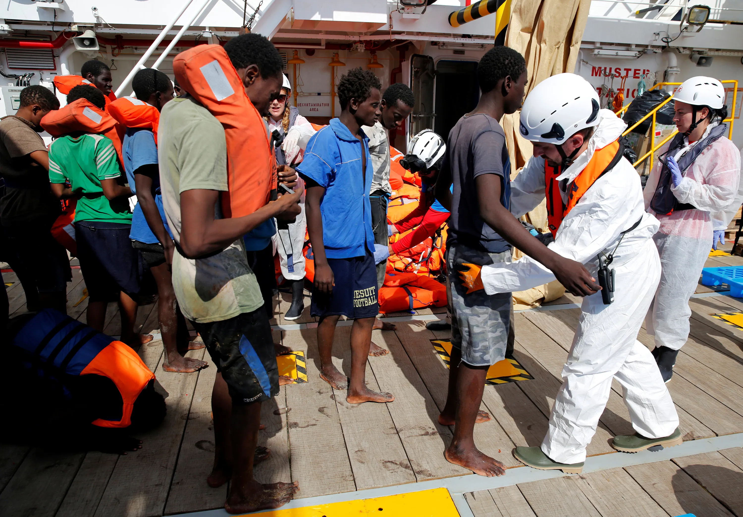 Migrants are searched by Migrant Offshore Aid Station (MOAS) personnel after boarding the MOAS rescue ship Topaz Responder around 20 nautical miles off the coast of Libya, June 23, 2016. (Photo by Darrin Zammit Lupi/Reuters)