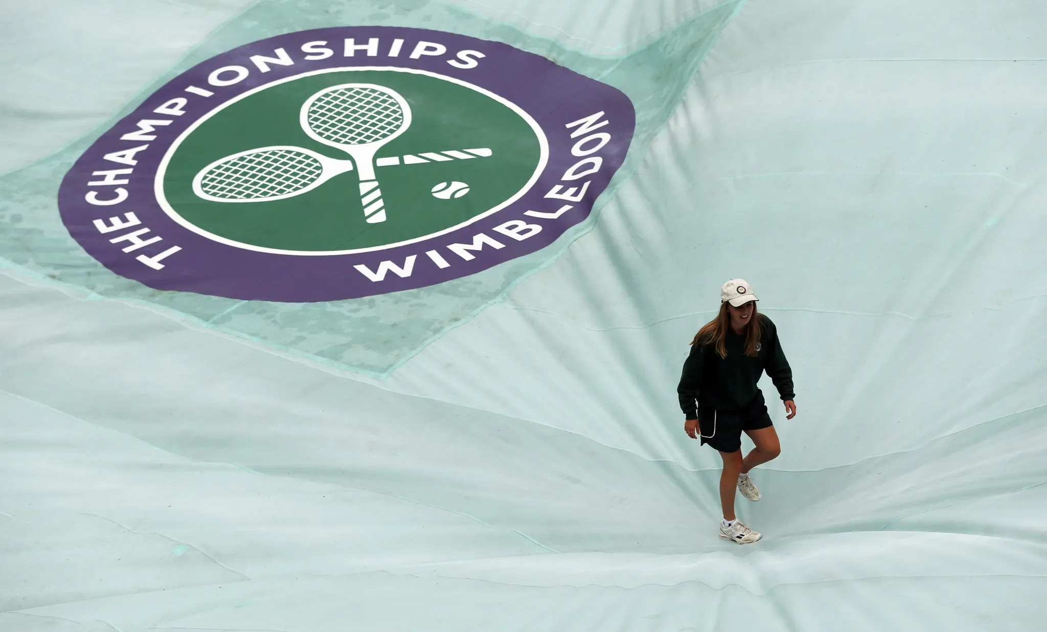 A member of the ground staff walks on the court cover, as rain delays play on day five of the Wimbledon Tennis Championships in London, Friday, July 1, 2016. (Photo by Ben Curtis/AP Photo)