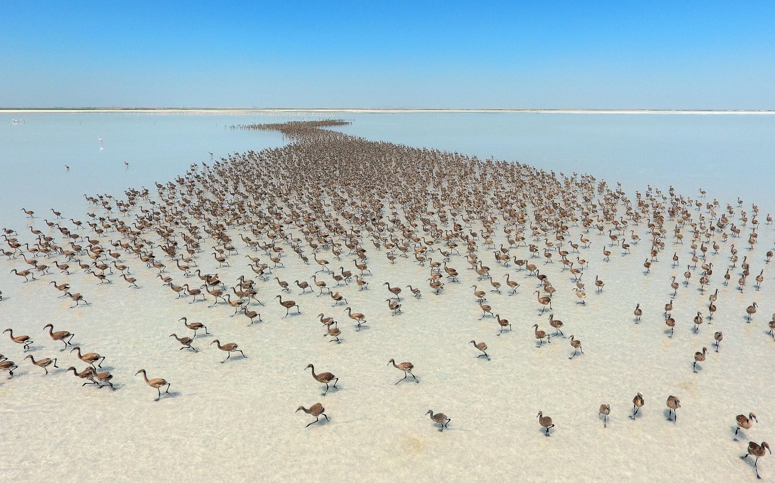 Thousands of flamingo chicks have emerged from their nests at Salt Lake, which is home to the biggest flamingo colony in Turkey and the Mediterranean basin, in Aksaray, Turkey, June 28, 2016. (Photo by Murat Oner Tas/Anadolu Agency/Getty Images)