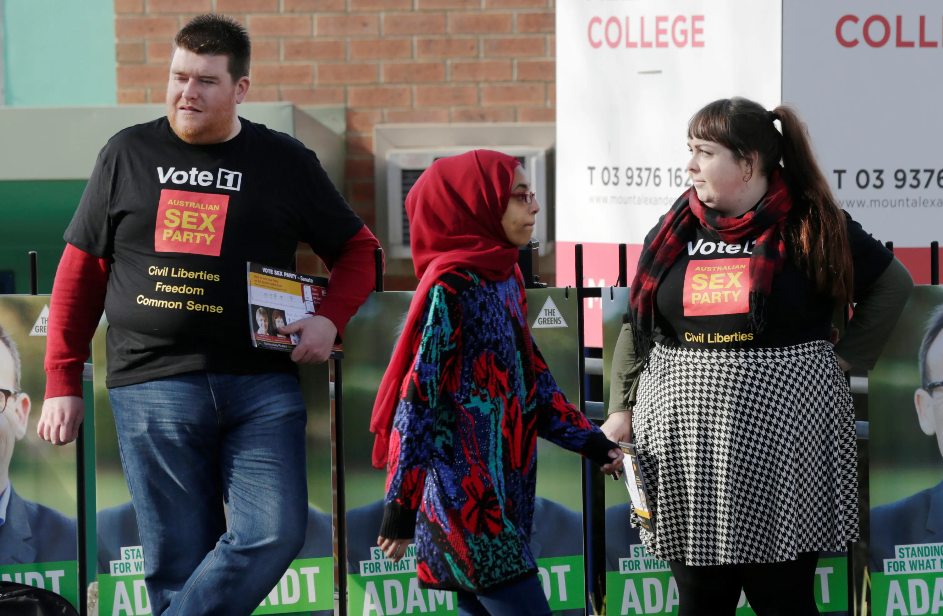 A woman walks past volunteers supporting the Australian Sex Party outside a polling station at Mount Alexander College in Flemington, Melbourne, July 2, 2016 on Australia's federal election day. (Photo by Jason Reed/Reuters)
