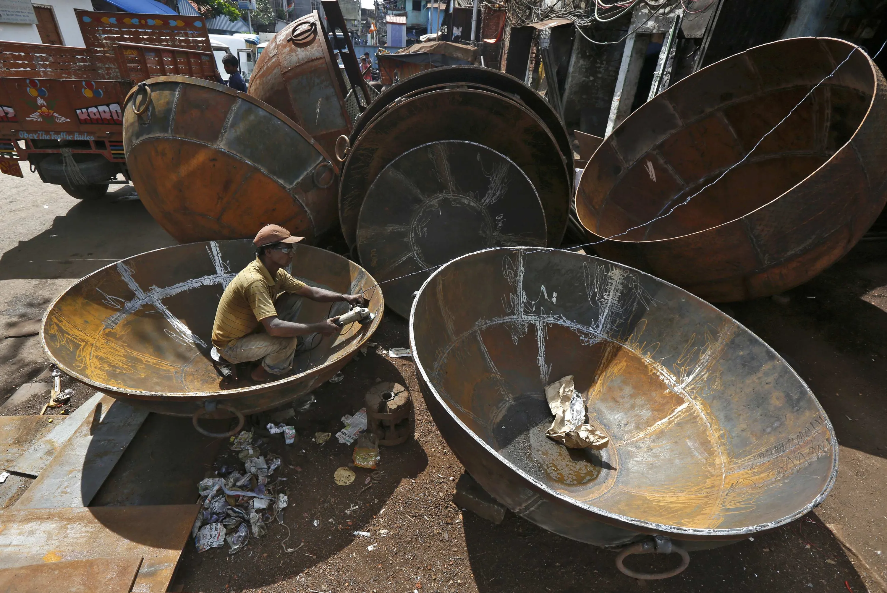 A worker uses a grinder on the joints of a giant utensil at an iron utensils manufacturing unit in Kolkata, India, June 28, 2016. (Photo by Rupak De Chowdhuri/Reuters)