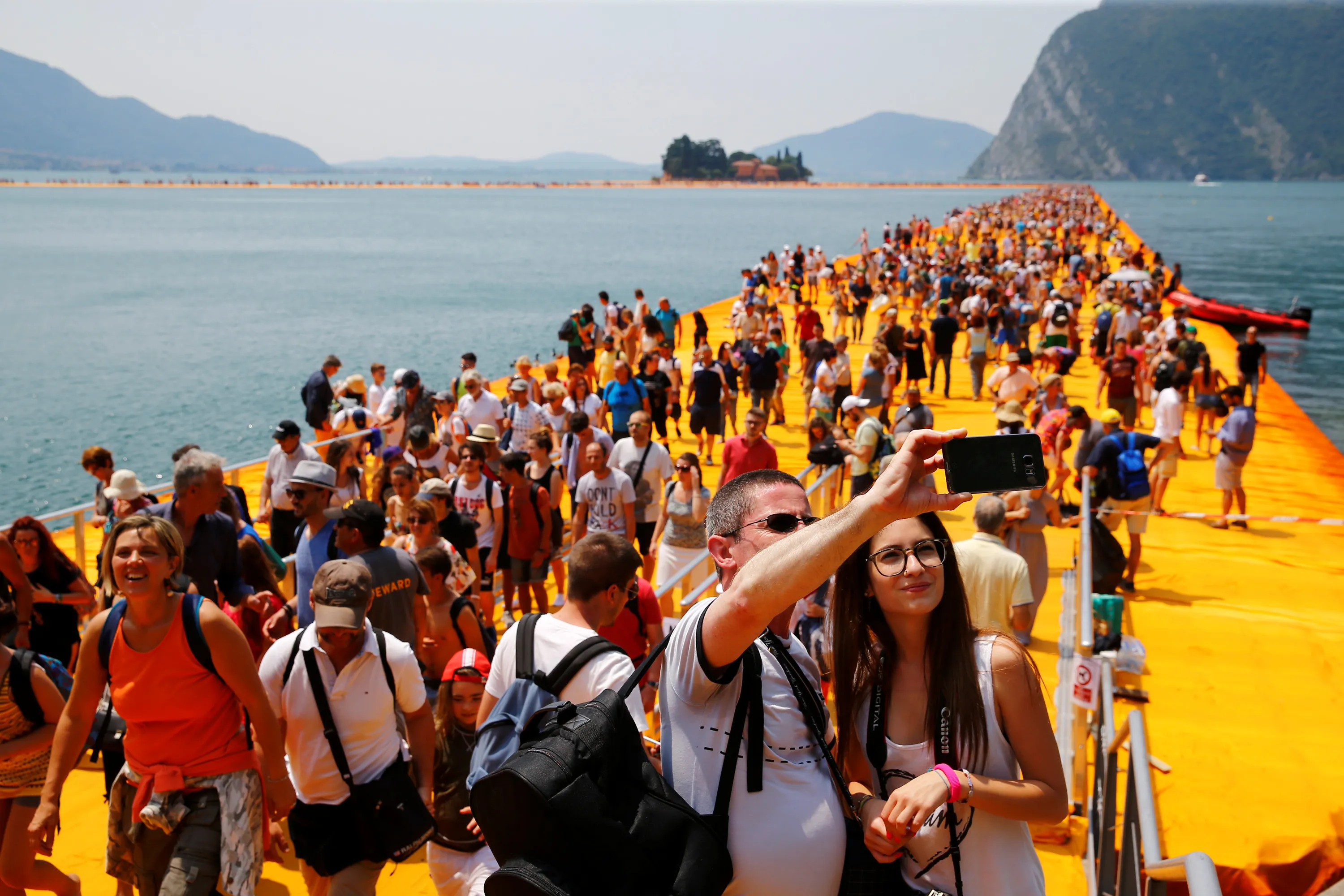 People take selfies on the installation “The Floating Piers” on Lake Iseo by Bulgarian-born artist Christo Vladimirov Yavachev, known as Christo, at the installation's last weekend near Sulzano, northern Italy, July 2, 2016. (Photo by Wolfgang Rattay/Reuters)