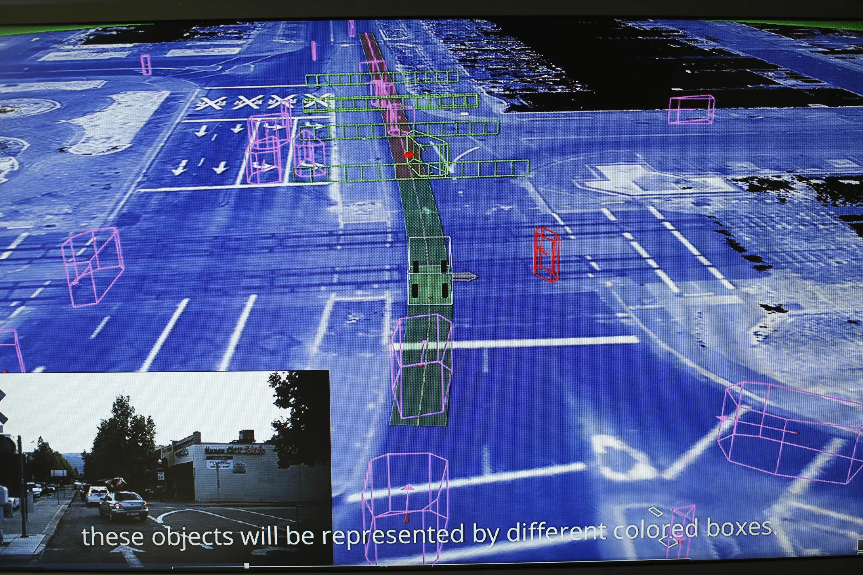 A screen displays views from various onboard sensors in a Google self-driving vehicle at the Computer History Museum before a presentation in Mountain View, California, 2014. (Photo by Stephen Lam/Reuters)
