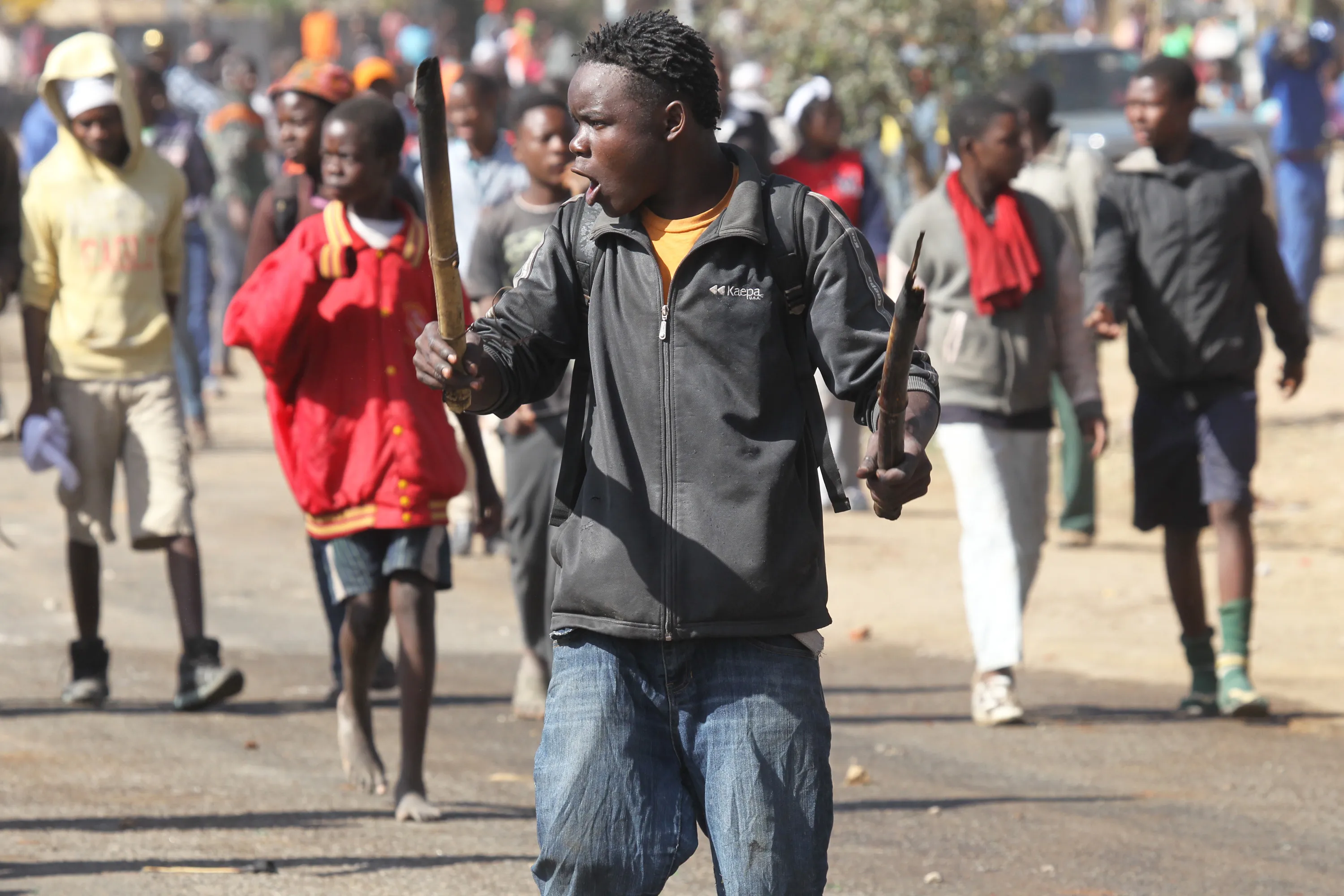 Rioters battle with Zimbabwean police in Harare, Monday, July, 4, 2016. (Photo by Tsvangirayi Mukwazhi/AP Photo)