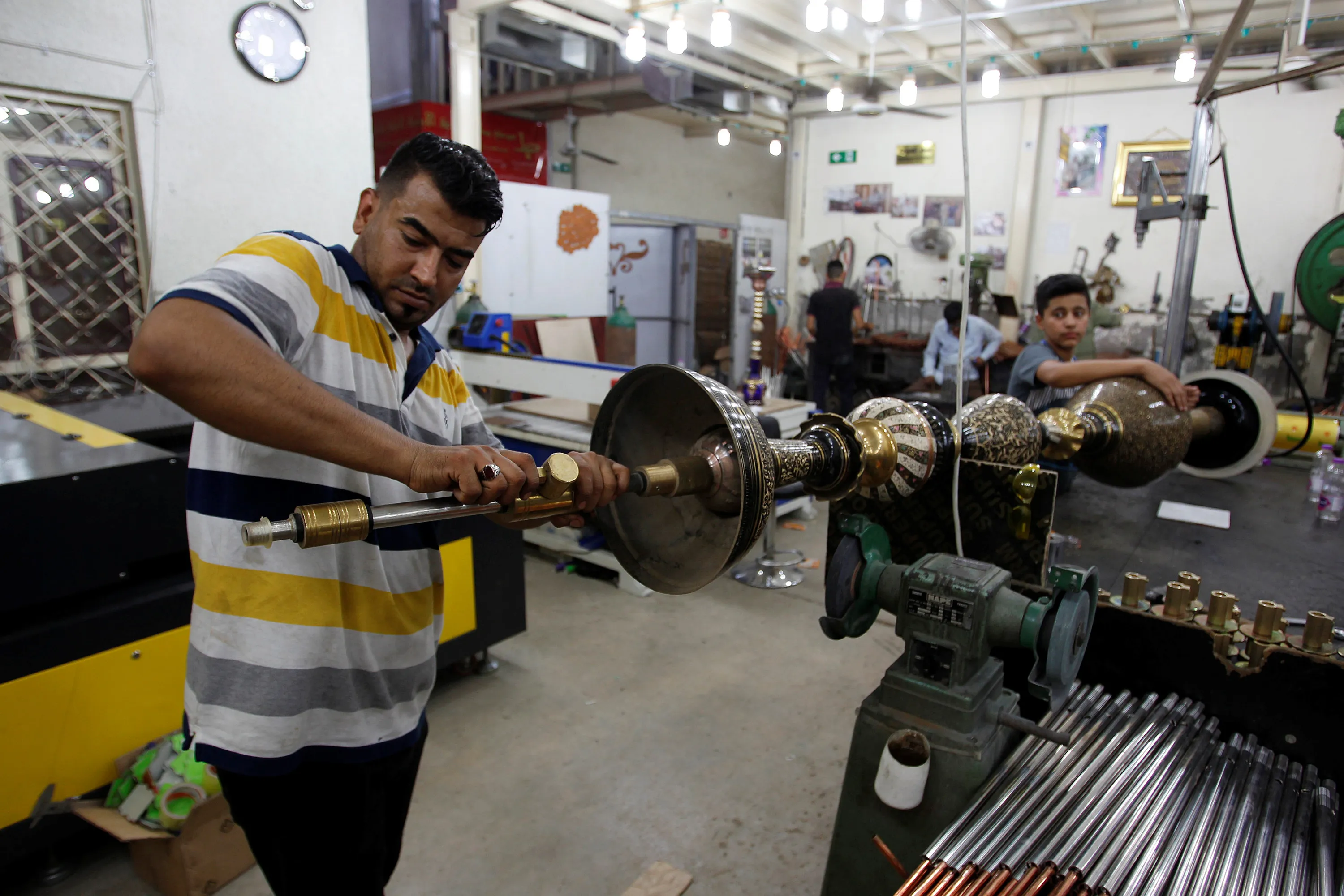 Men work on a giant hookah at the Taha hookah factory in Baghdad, Iraq July 2, 2016. (Photo by Khalid al Mousily/Reuters)