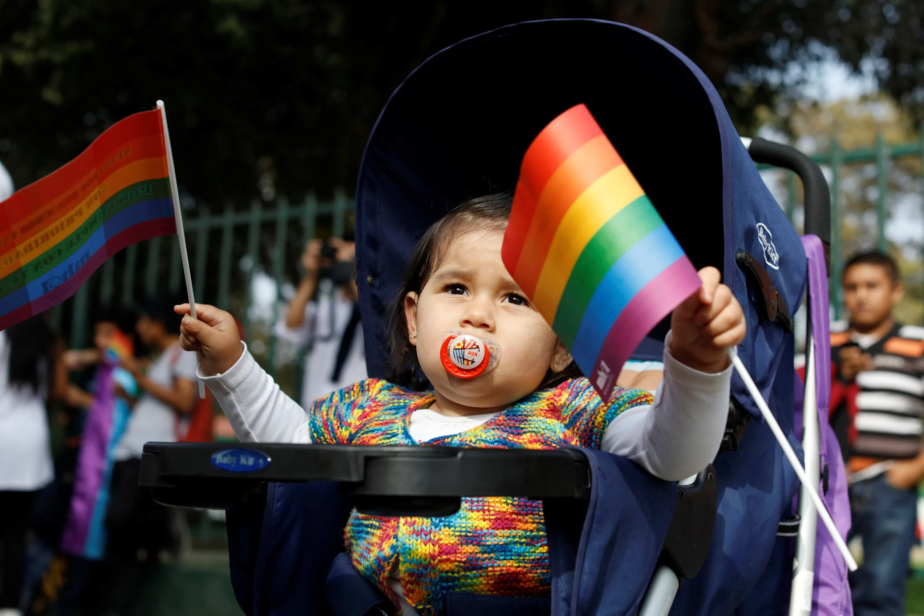 A baby holding rainbow flags attends a gay pride parade in downtown Lima, Peru on July 2, 2016. (Photo by Guadalupe Pardo/Reuters)