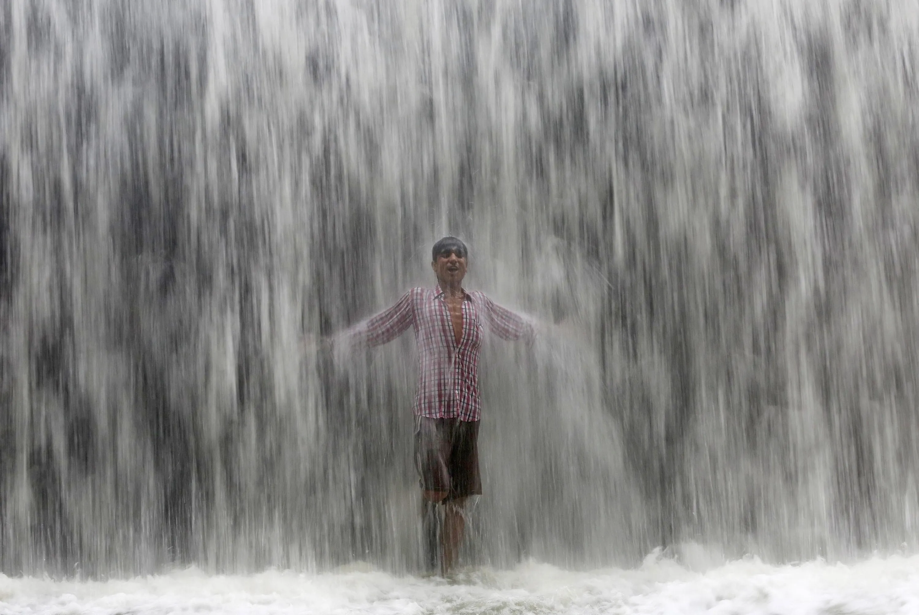 A boy stands under an overflowing dam along the Powai lake after heavy rains in Mumbai, India, July 4, 2016. (Photo by Shailesh Andrade/Reuters)